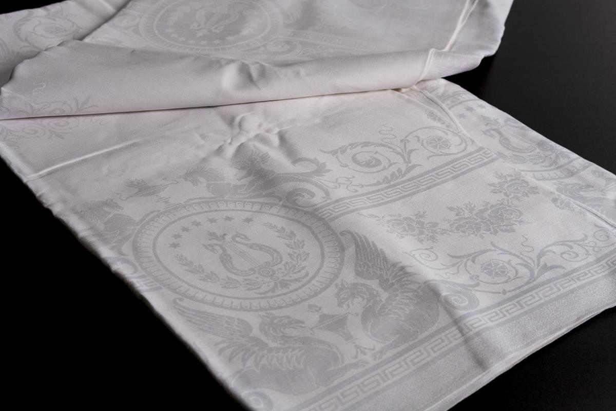 Feines Tuch mit Grotesken-Ornamenten, Rankenzier, Fabelwesen und Mäanderbanddekoren.