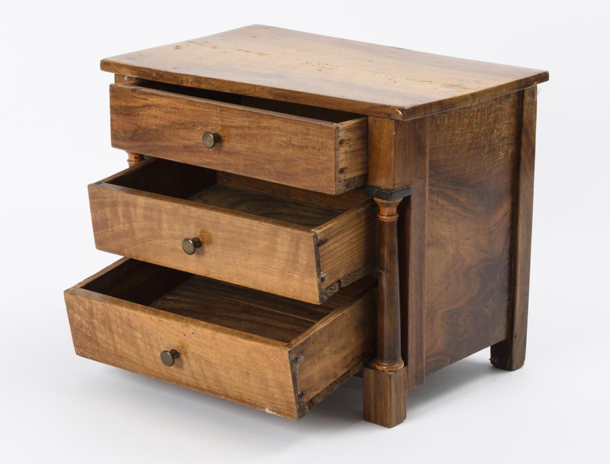 3-schübige Kommode mit Vollsäulen an den Seiten sowie vorspringender oberer Schub. Alters-/Gebrauchsspuren, Furnierschäden ausgekittet, Ergänzungen.
