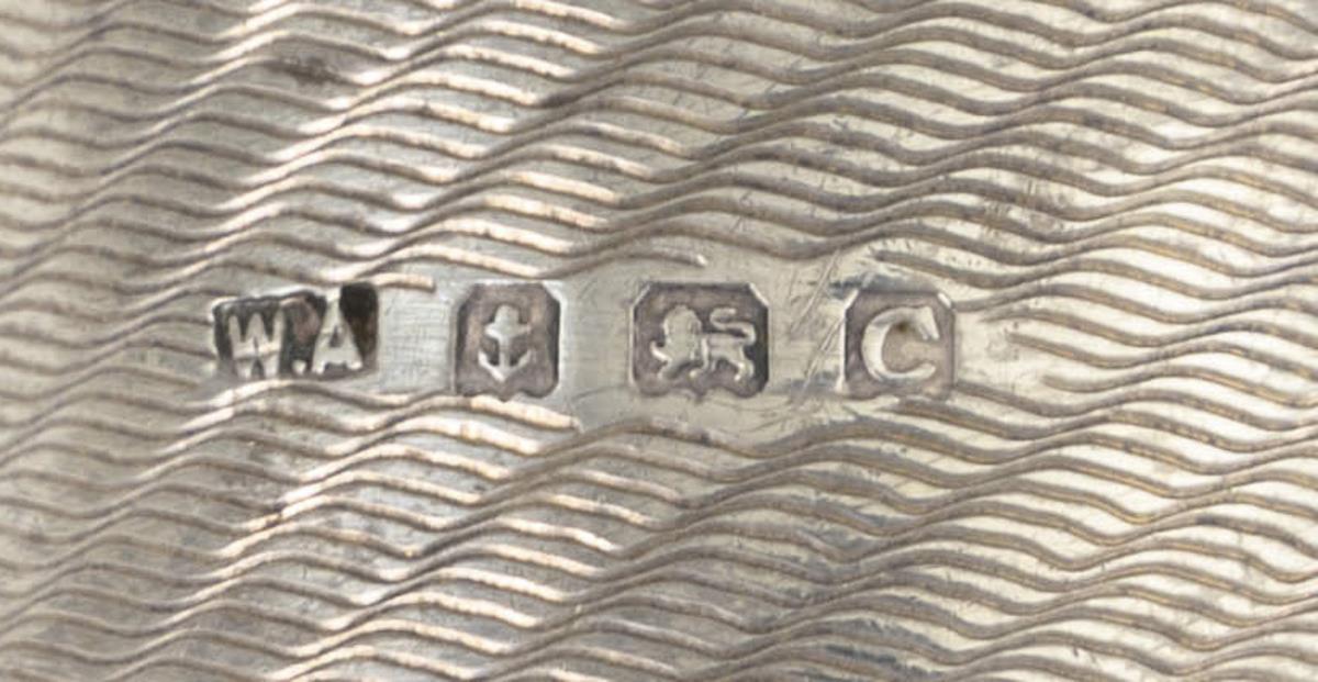 Reliefierter Serviettenhalter, Senftöpfchen mit blauem Glaseinsatz, Salzstreuer und 3 monogrammierte Serviettenringe. Leichte Gebrauchsspuren.