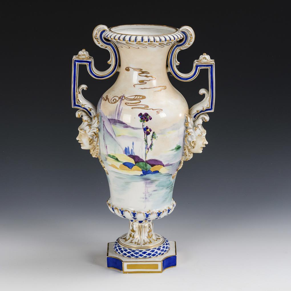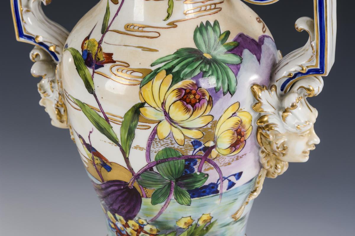 Balusterkorpus mit zwei gewinkelten Henkeln über Maskaronen, Rundfuß und Quadratplinthe mit angeschnittenen Ecken. Im asiatischen Stil umlaufend die Darstellung einer Teichlandschaft mit Blumen und Vögeln. 2 Chips und 2 kleine Bestoßungen am Rand der Plinthe.