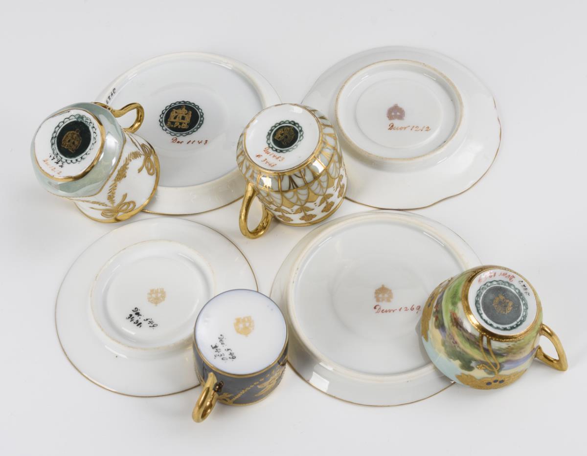 Verschiedene, prunkvolle Tassen mit ornamentaler und floraler Goldreliefmalerei, teils mit Lüsterfond, 1x mit Landschaftsmalerei. 1x mit ergänzter Untertasse. 1 Untertasse mit Haarrissspinne, 1 Tasse mit Haarriss.