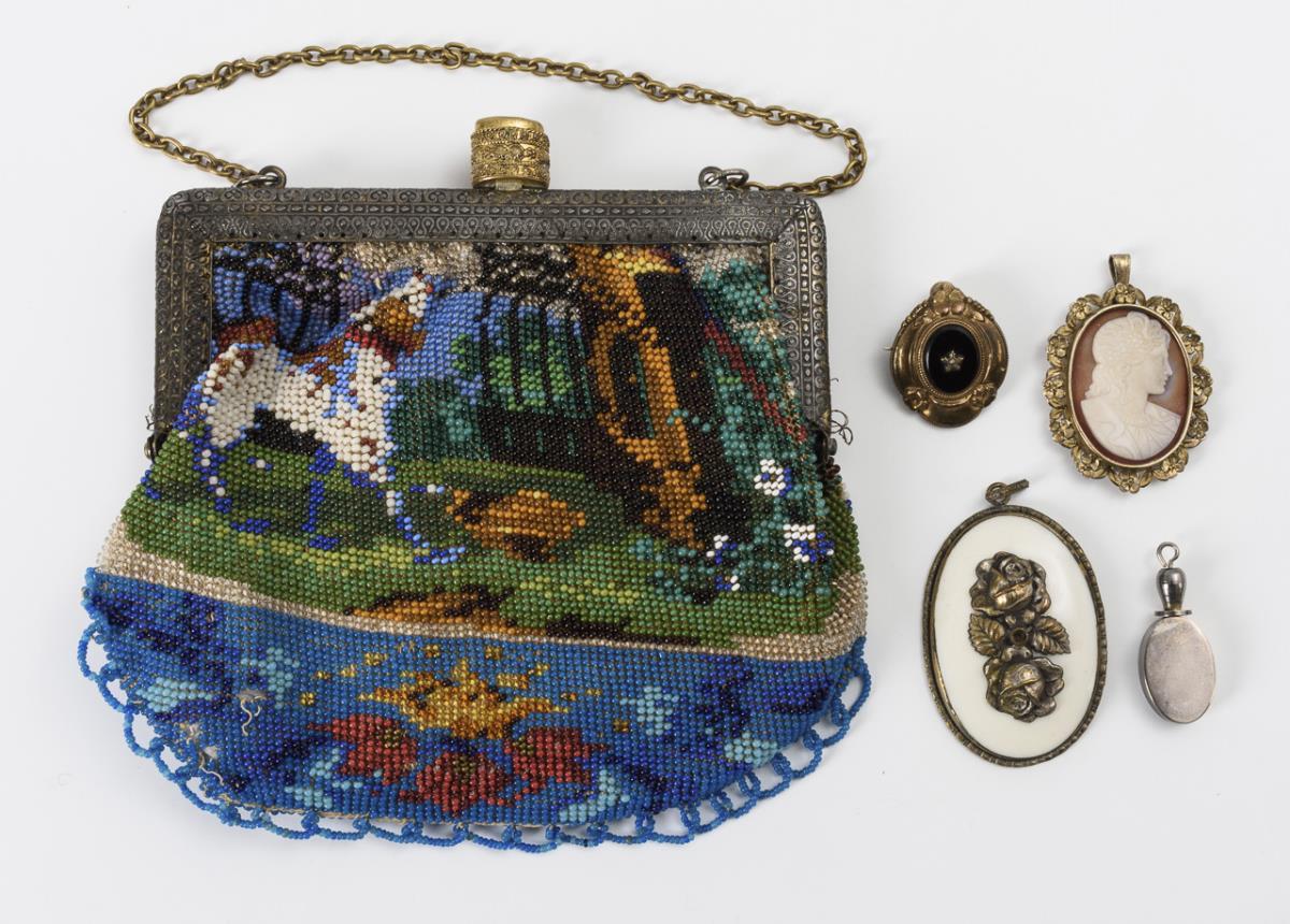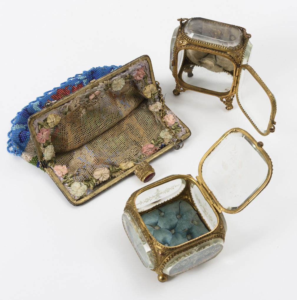 Perltasche beidseitig mit Hundemotiv; Metallbügel mit Glassteinen und -drücker sowie Kette. / Im marmorierten Papp-Etui Fingerhut aus Silber (geprüft) mit Beinahle. / Reliefierte Messing-Schauvitrinen allseits facettiert verglast, 1x allseits vegetabiles Schliffmuster; innen Samt. / 1 Biedermeier-Brosche, 1 Achat-Kamee mit Frauenkopf, 1 silberfarbene Anhänger mit Rosen auf weißem Glas, 1 Miniatur-Riechfläschchen aus Metall. Kleine Löcher an der Tasche, Samt in den Vitrinen teils zerschlissen, teils geringe Alters-/Gebrauchsspuren.
