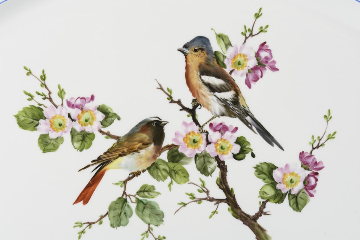 Form "Neuer Ausschnitt". Im Spiegel die Darstellung eines Rotkehlchens und eines Rotschwänzchens auf einem blühenden Apfelzweig. Minimaler Randabrieb.
