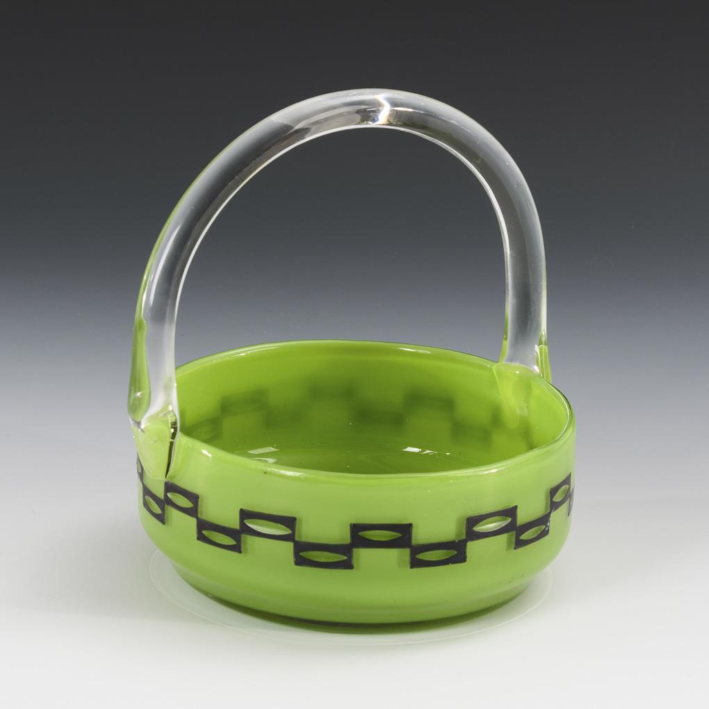 Farbloses Glas mit grünem Innenfang und Klarglasüberfang; ausgekugelter Abriss. Ø 16 cm, H 18 cm.