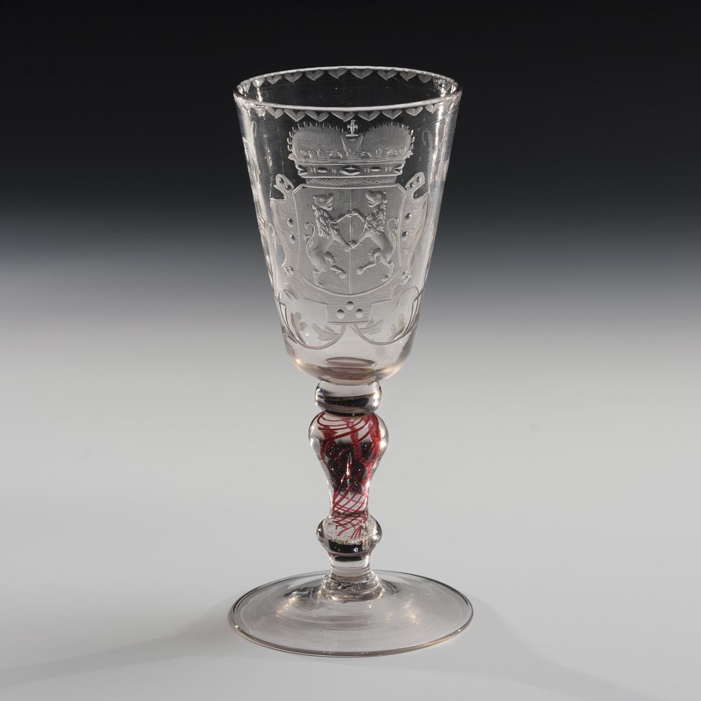 Konische Kuppa, massiver Balusterschaft mit eingeschmolzenen Rubinfäden und stecknadelförmiger Luftblase, Rundfuß; Abriss. Schauseitig auf der Kuppa die gravierte Darstellung eines Wappenschildes mit zwei Löwen unter einem Kurhut.