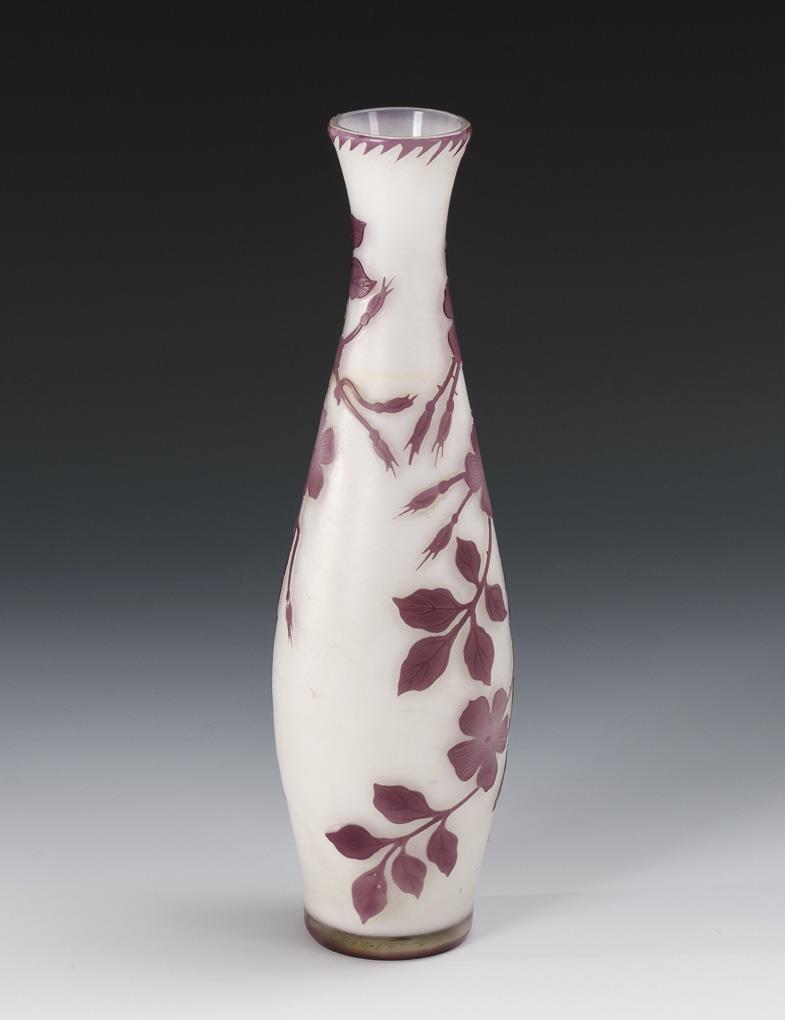 Schlanke Birnvase mit umlaufend geätzten, blühenden Dornenranken. Minimaler Chip an 1 Knospe.