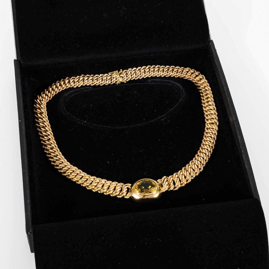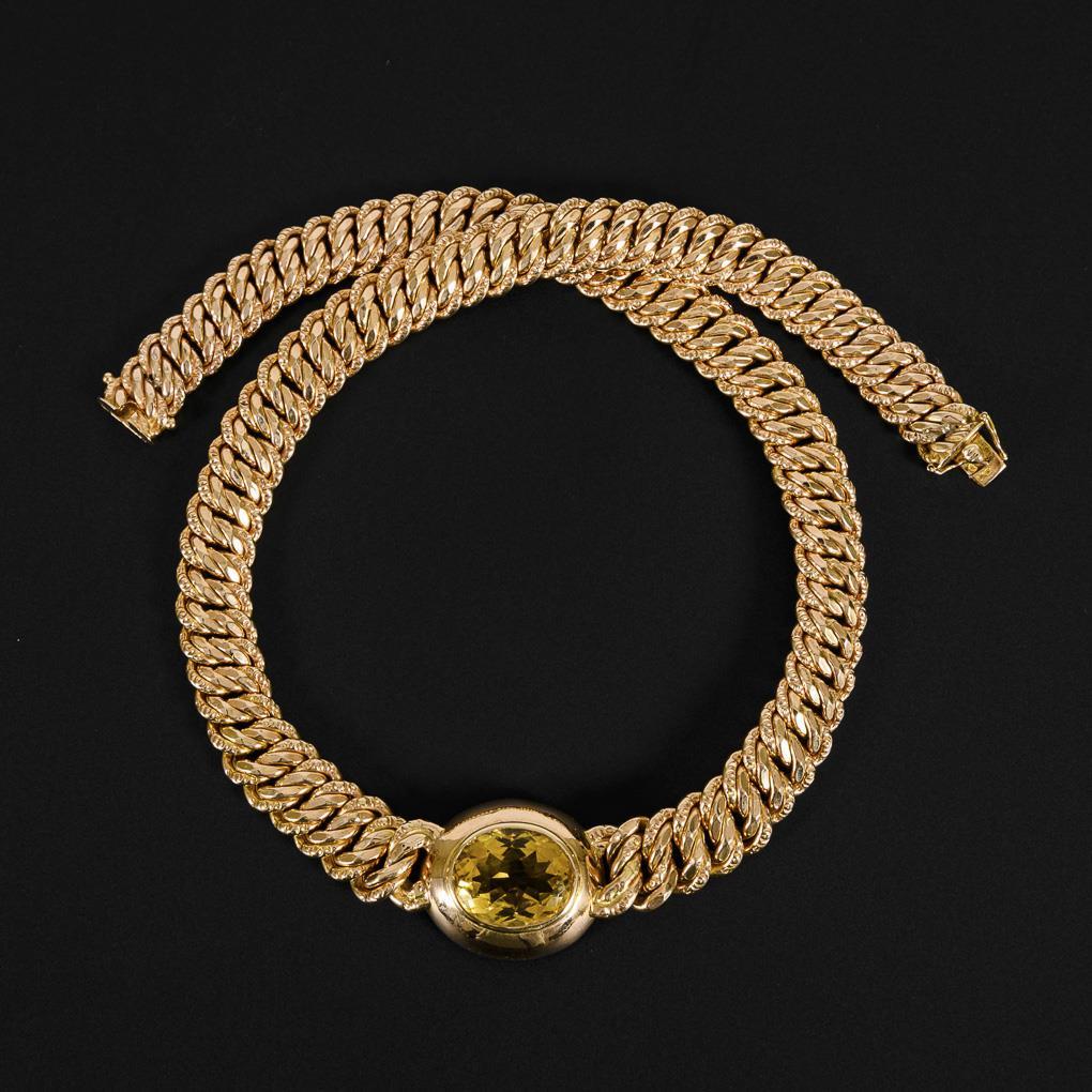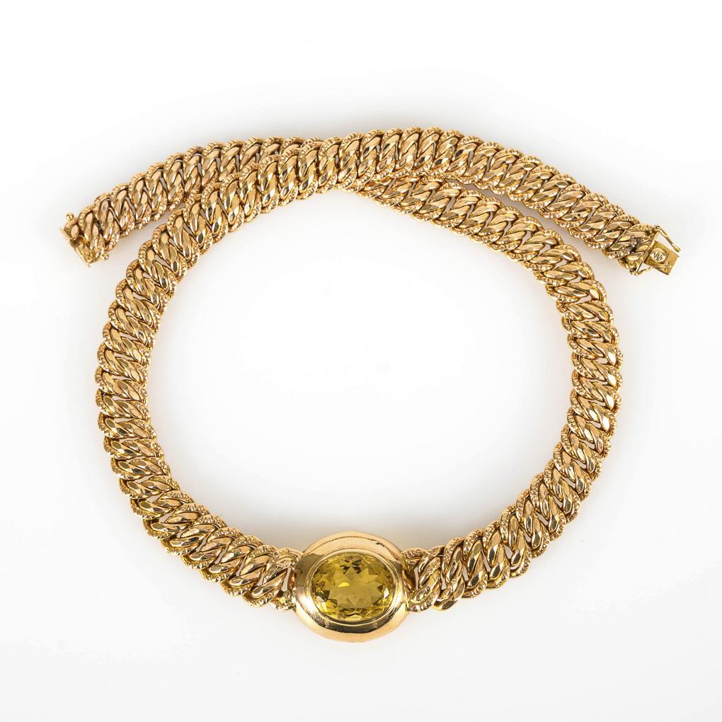 Zargengefasster Citrin, zwischen Zwillingspanzerkette in Hohlform. Kastenschloss mit 2 Achtersicherungen.