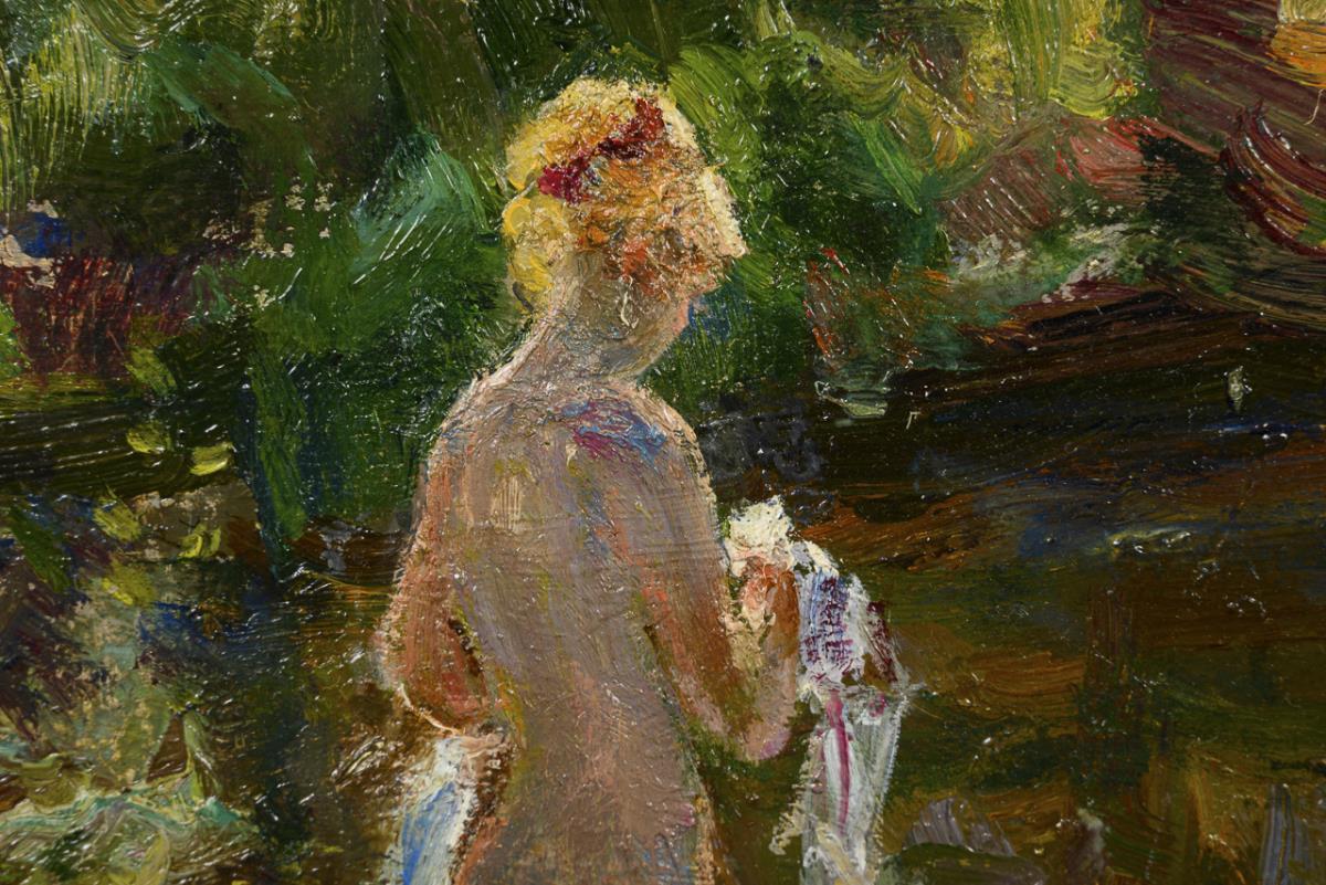 Zwei nackte Frauen im Sonnenschein am Fluss.