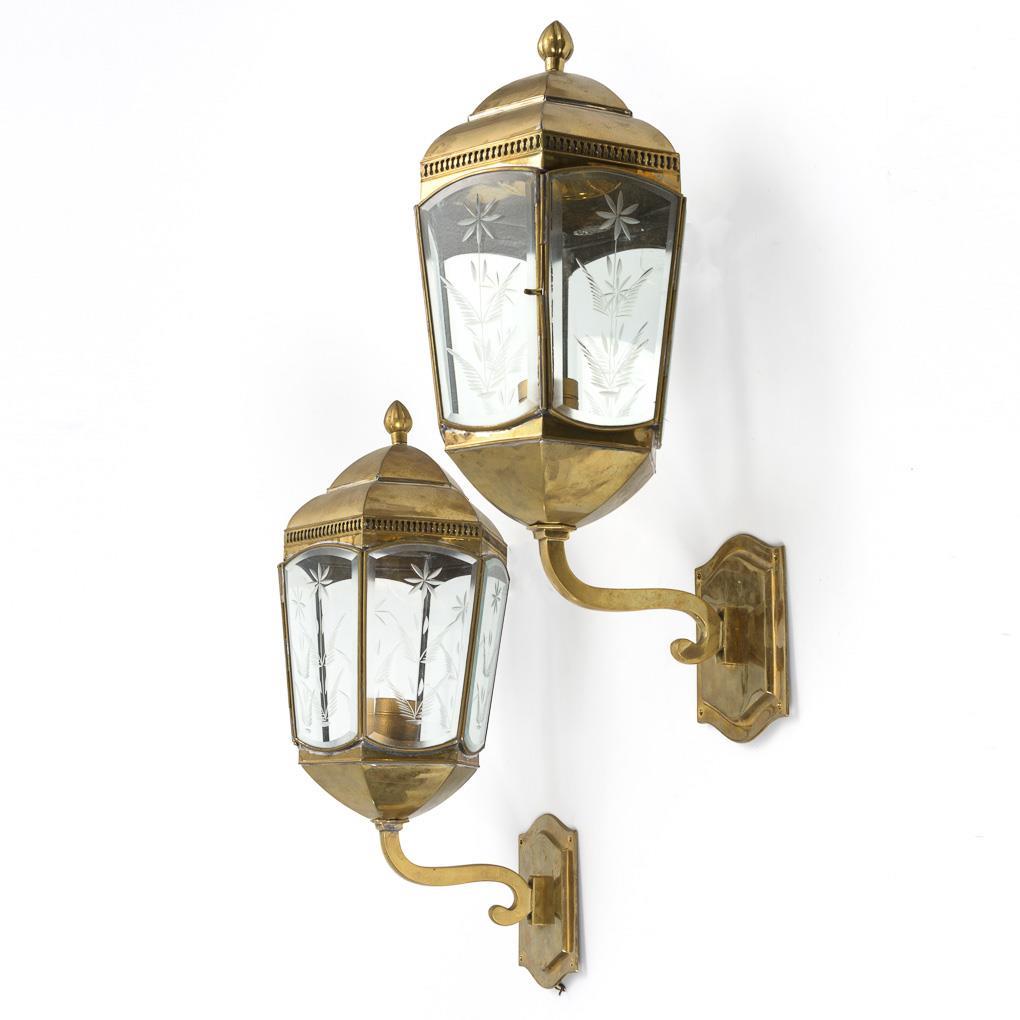 Paar 1-flammige Wandlampen mit glockenförmiger Haube und hexagonalem Korpus, an geschweiftem Schaft mit Wandhalterung, Glaseinsätze mit floralem Schnittmuster. Metall mit Korrosionsspuren, Porzellanfassungen goldfarben bemalt, sichtbare Lötstellen.