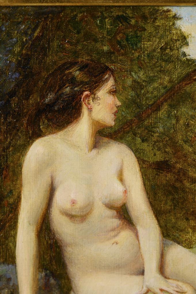 Zwei Gemälde mit Frauenakten: "Akt auf Felsen" und "Nackte am Fluß"