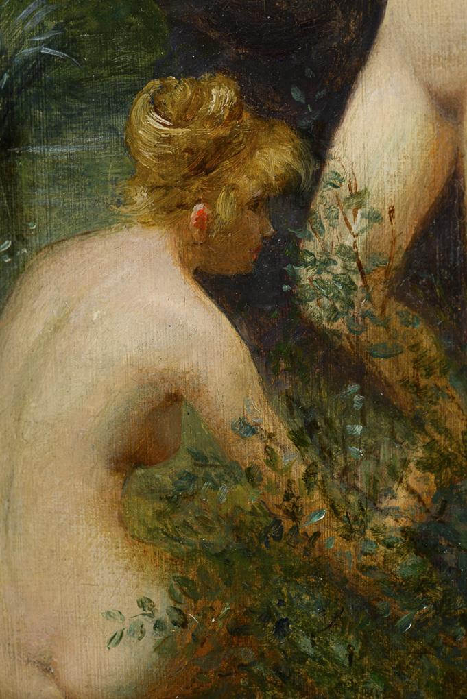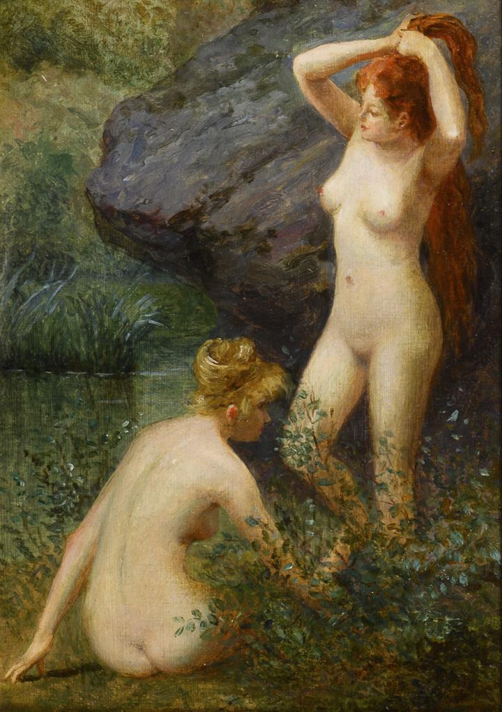 Zwei Frauen nahe einem Felsen sowie eine am Fluss sitzende, nackte Frau. Je retuschiert.