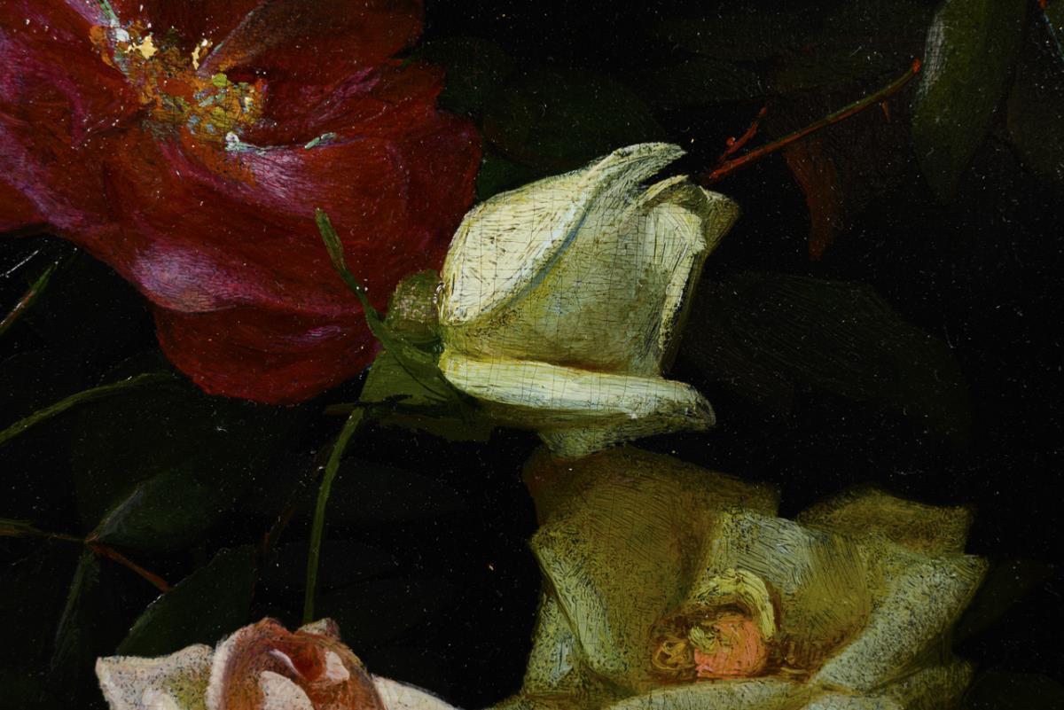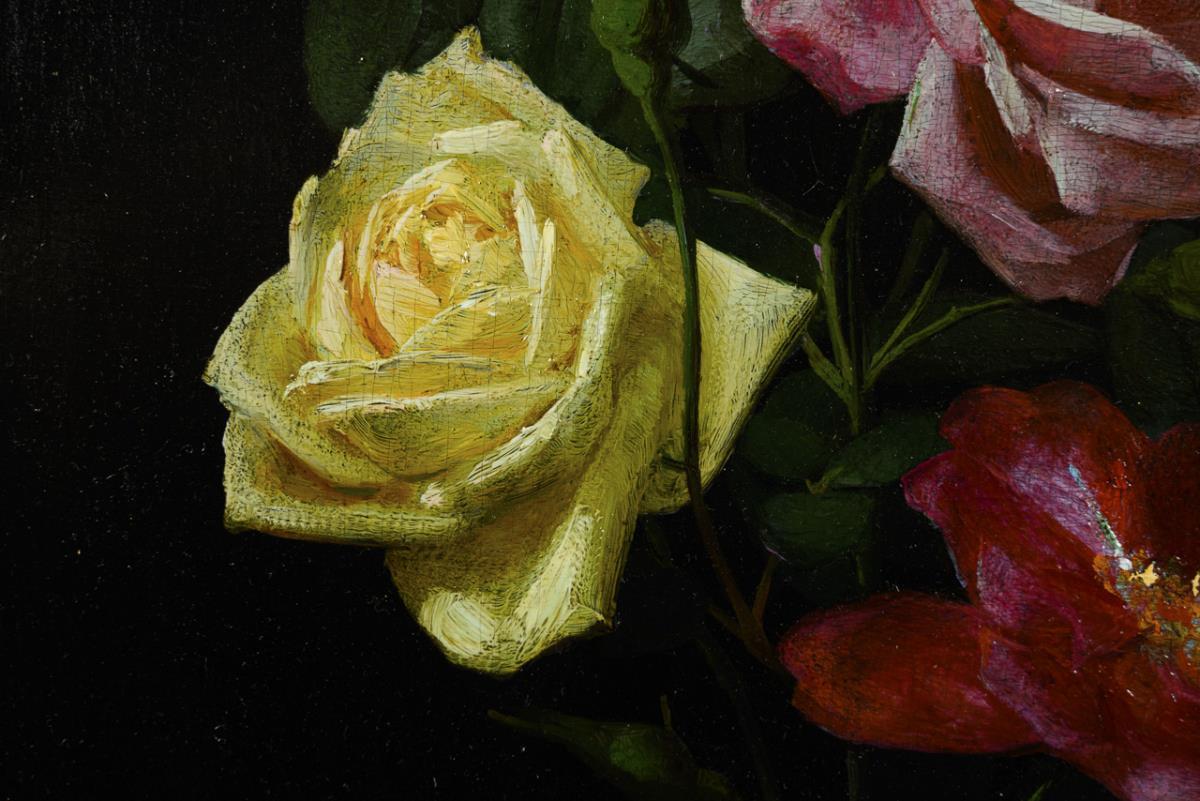 Verschiedenfarbige Rosen mit geschlossenen und weit geöffneten Blüten vor dunklem Hintergrund.