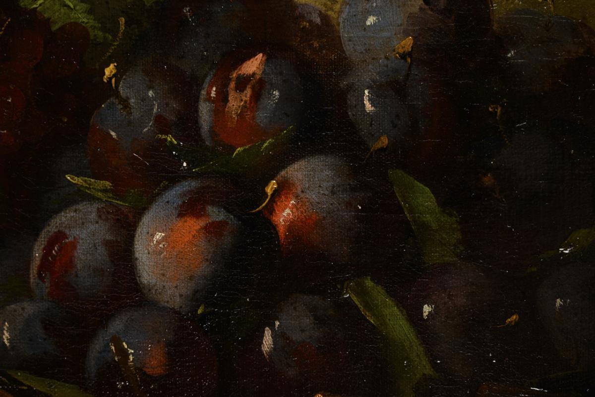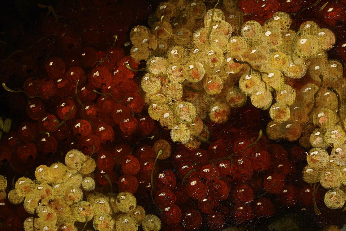 Weidenkörbe mit Pflaumen und Johannisbeeren in hellem Licht auf dem Boden. Restauriert.