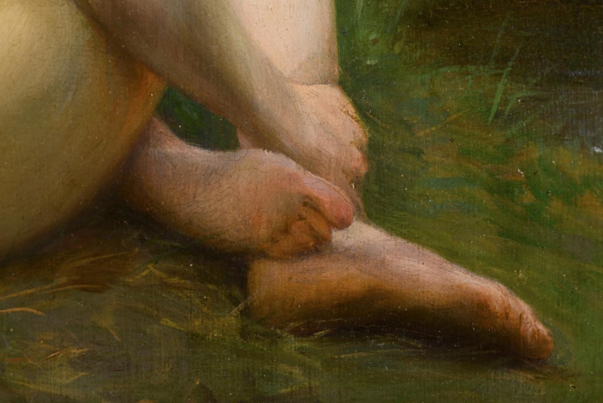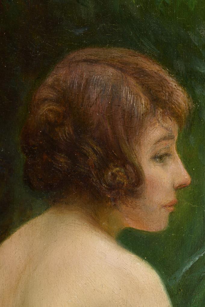 Junge, nackte Frau im Gras nahe dem Seeufer sitzend. Kleine Nagellöcher an den Rändern.
