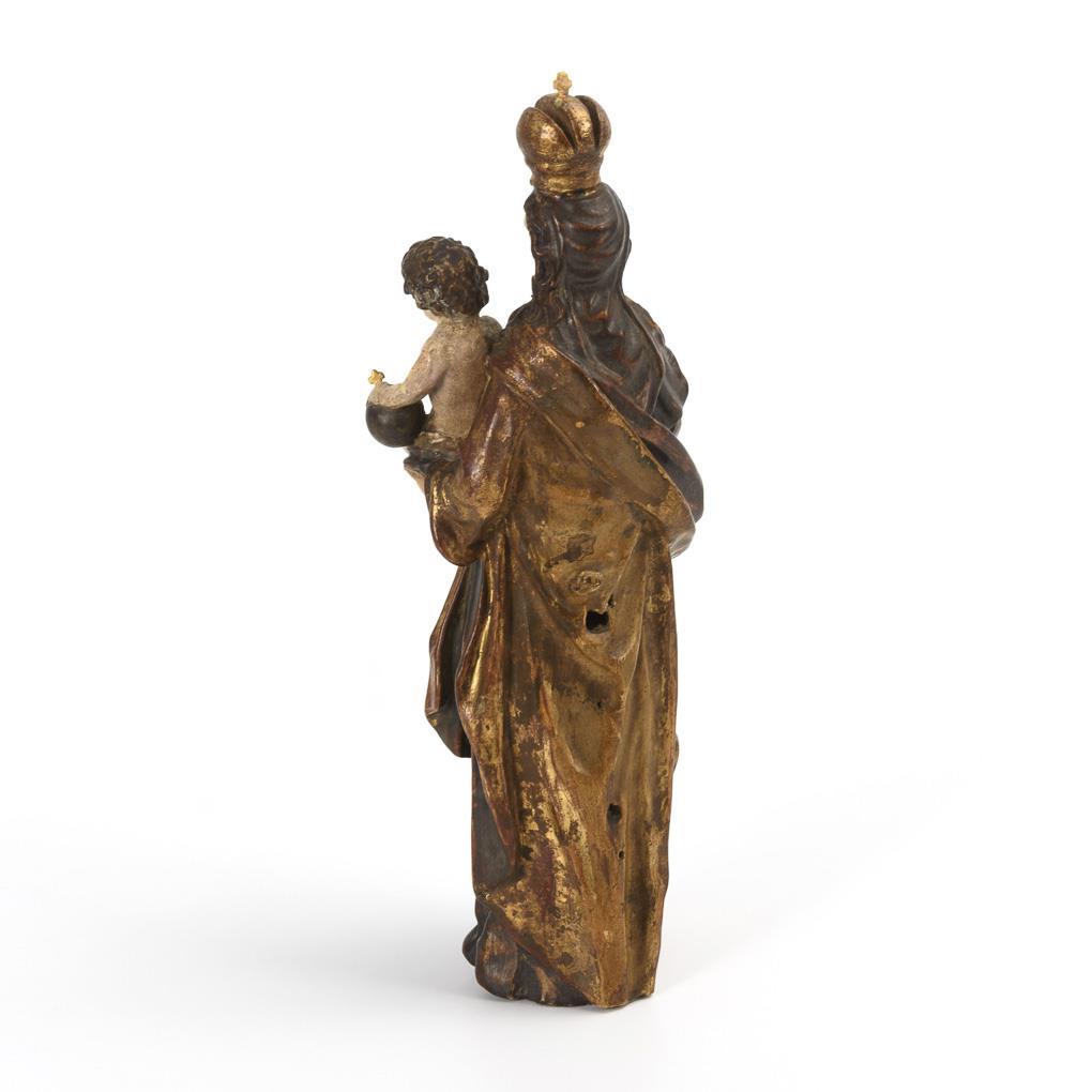 Vollplastische Standfigur der gekrönten Maria im überaus reich gefalteten Mantel. In ihrer Linken trägt sie das nackte Jesuskind mit Lendentuch, das wiederum die Weltkugel hält, während seine Rechte im Redegestus erhoben ist. Wenige Alters-/Gebrauchsspuren, Fassung übergangen.