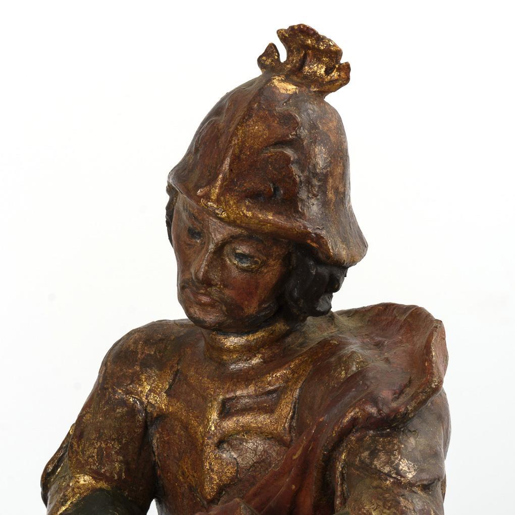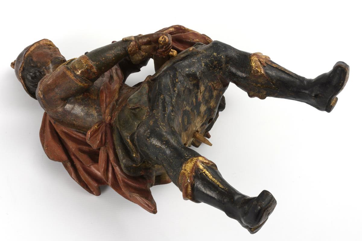 Auf eine Hauptansicht hin gearbeitete Figurengruppe mit vollplastisch gearbeitetem Pferd auf geschweifter Plinthe und (abnehmbarem) Reiter. Der hlg. Martin von Tours in antikisierender Rüstung teilt seinen faltenreichen Mantel mit dem Schwert und wendet sich dabei der Hauptschauseite zu. Im Germanischen Nationalmuseum Nürnberg restauriert mit wenigen Ergänzungen und originale Fassung freigelegt, teils retuschiert. Ohne Bettler. Trockenrisse, Fehlstellen am Leder, Alters-/Gebrauchsspuren.