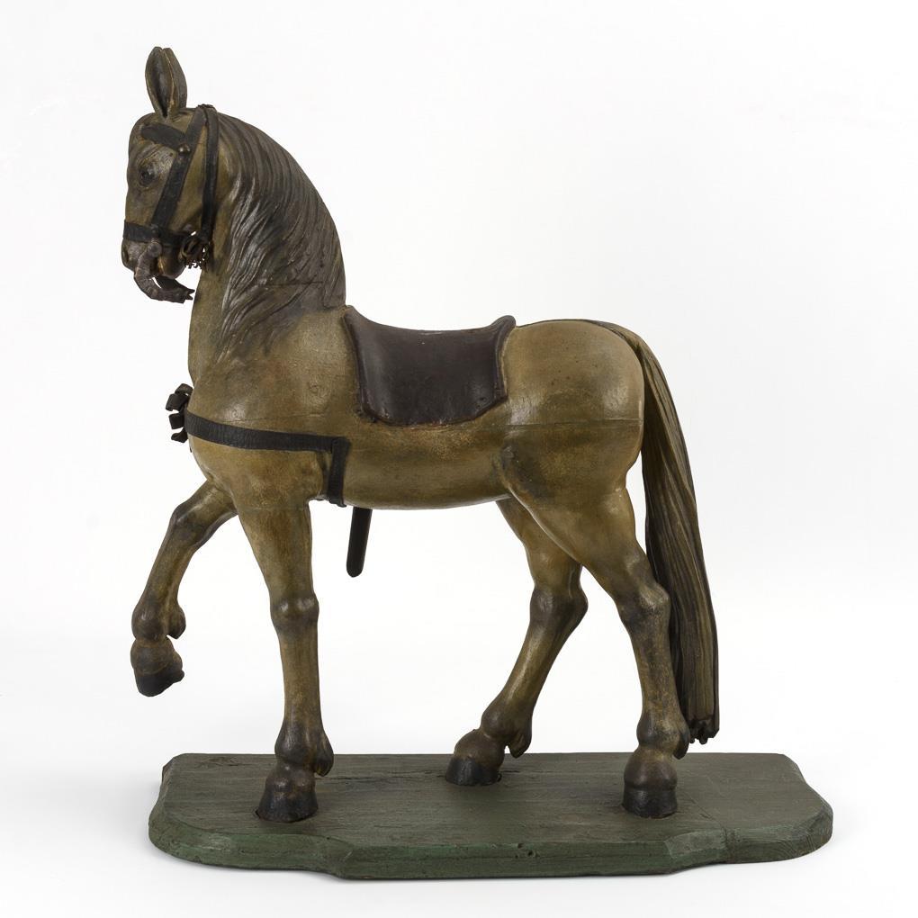 Holz polychrom gefasst und teils vergoldet, Lederbeschlag, Messing-Kandare. Um 1800(?). Ca. 78 x 65 x 28 cm. 9,5 kg.