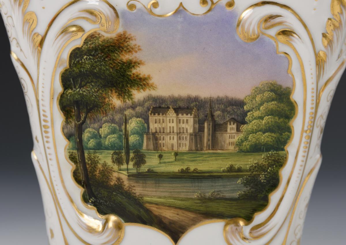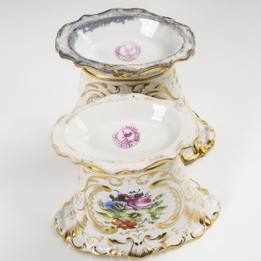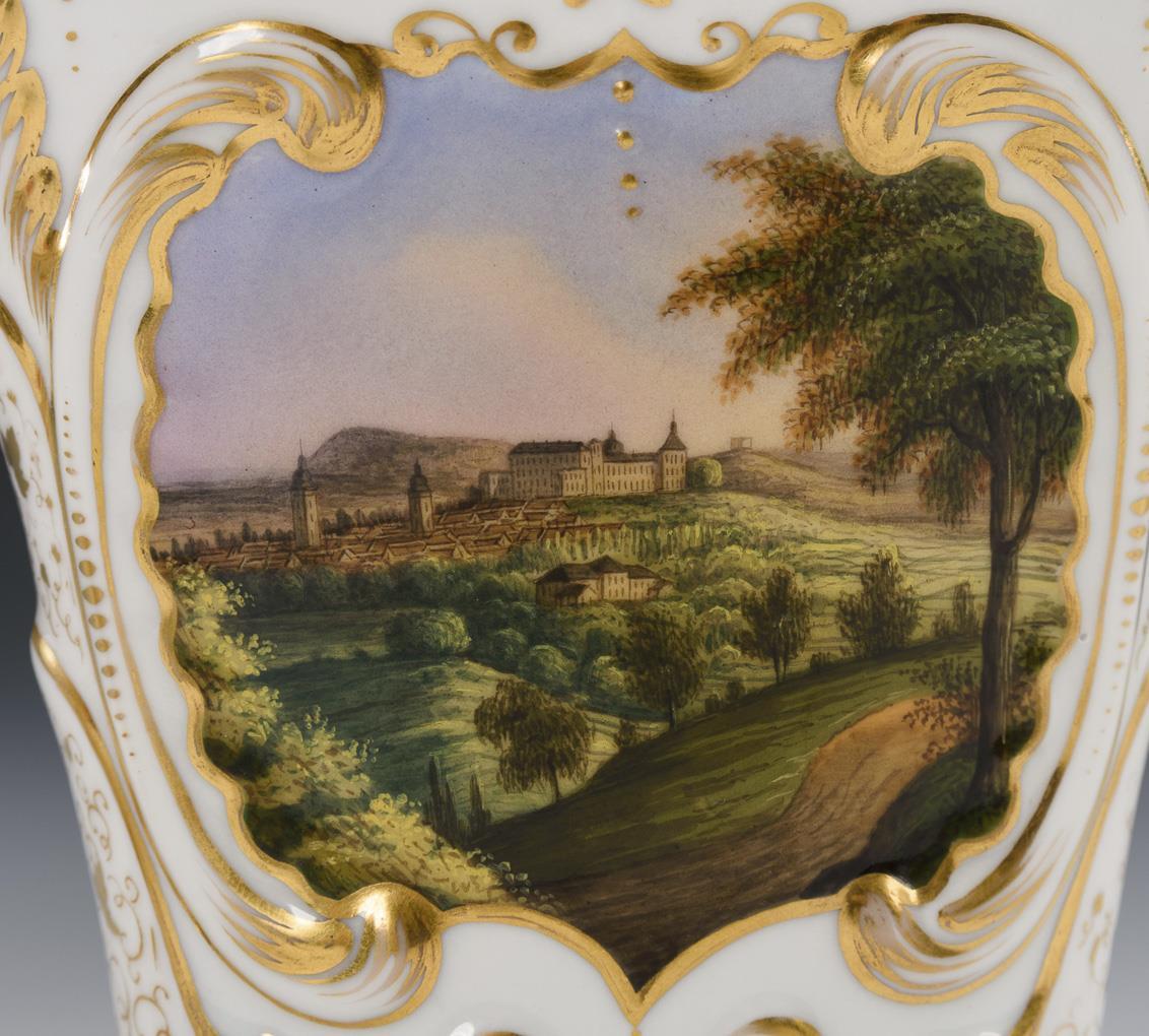 Kraterförmige Plattvasen mit Rocaillerelief. Schauseitig je eine rocaillegerahmte Kartusche, 1x mit der Ansicht von Gotha mit Blick auf Schloss Friedenstein und 1x mit der Ansicht des Schlosses Reinhardsbrunn, verso jeweils ein Blumenbukett. Minimaler Goldabrieb.