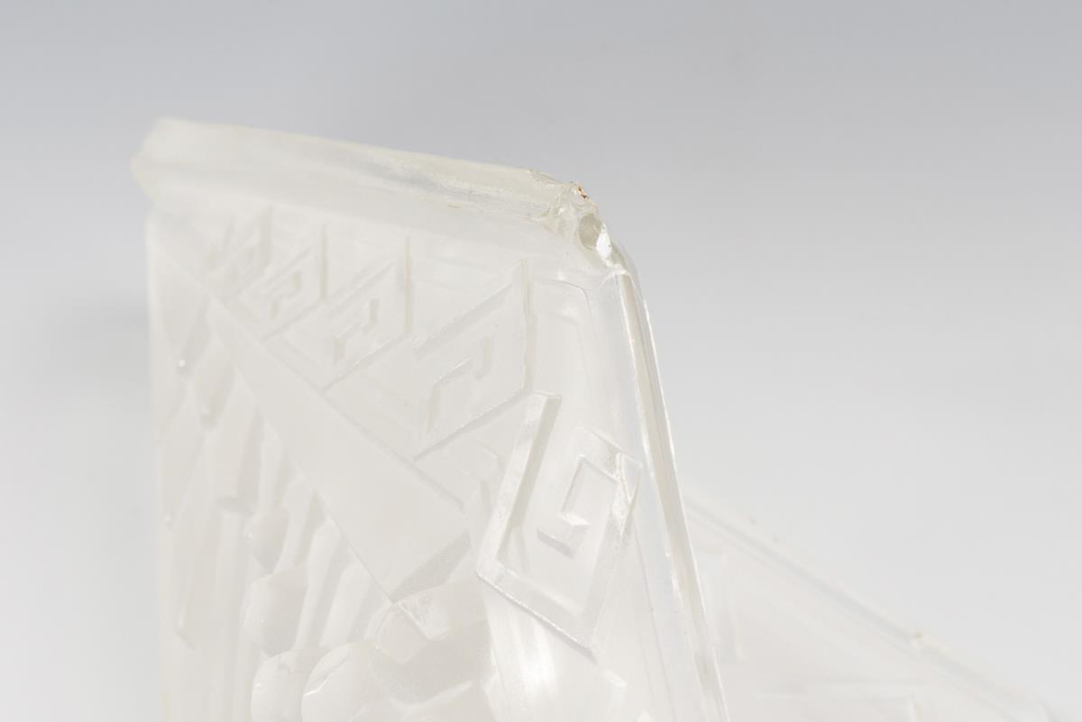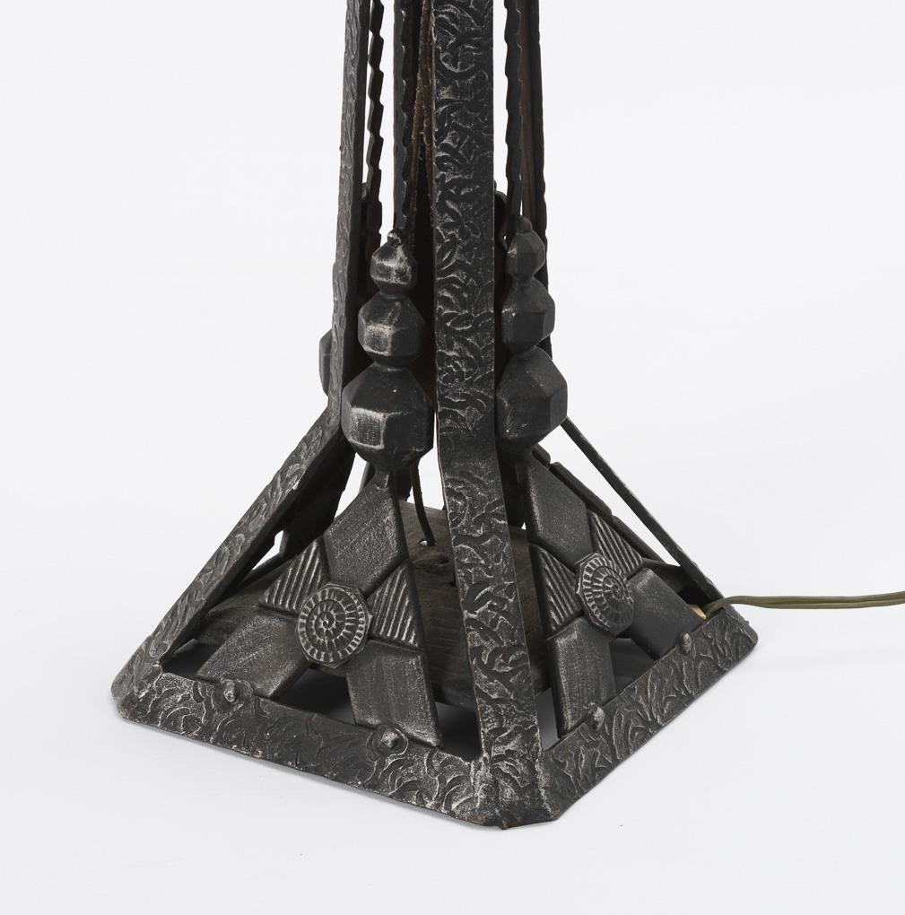 4-flammige Tischlampe in Form einer stilisierten Palme, akzentuiert mit stiltypischen Ornamenten, 4 einsetzbare, satinierte Glasschirme mit geometrischen Mustern. Glasschirme mit Bestoßungen.