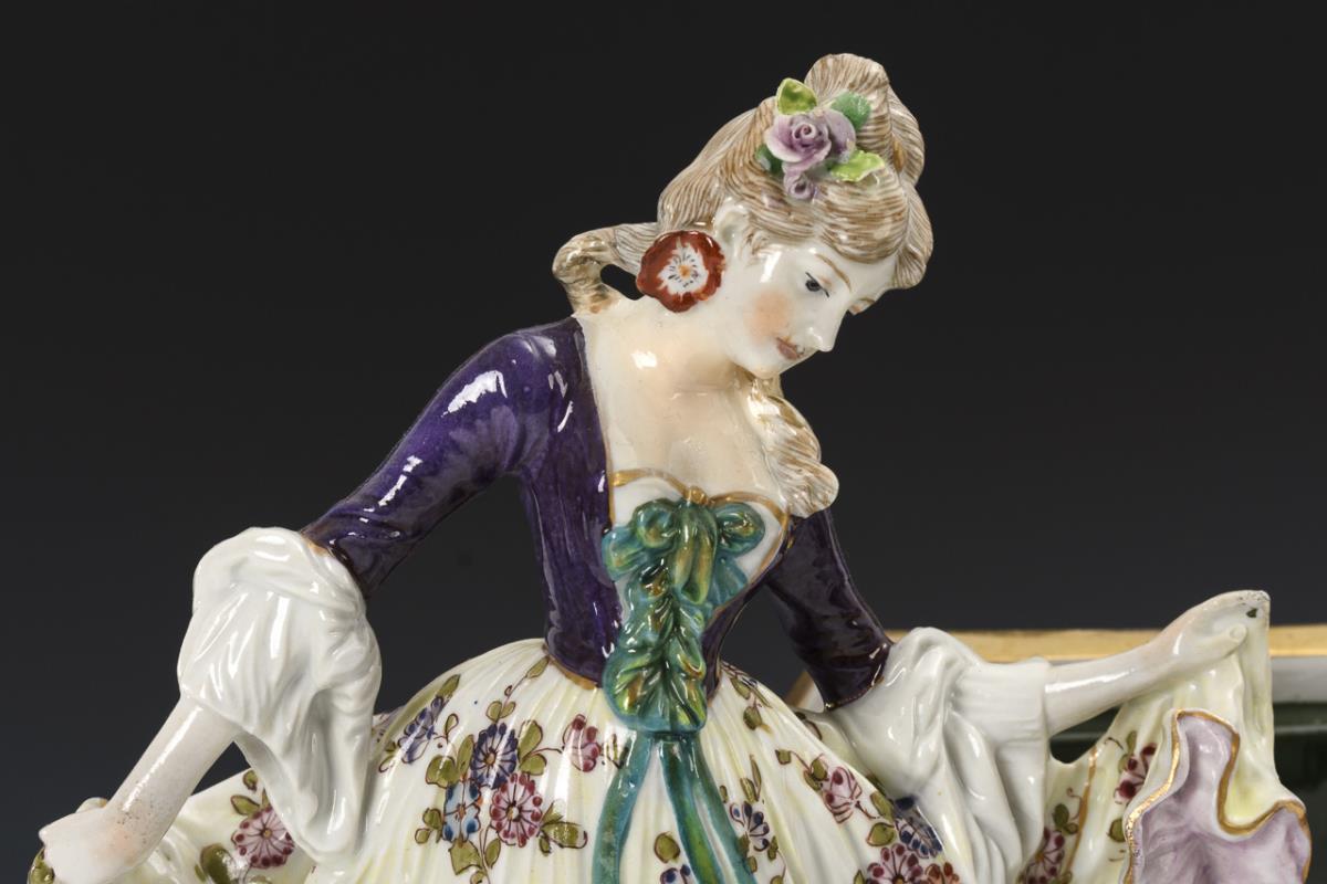 Auf einem Biedermeiersofa sitzender, eine Gitarre spielender Herr sowie eine zur Musik tanzende junge Dame. Minimaler Goldabrieb, Hals der Dame, linke Hand des Herren, Gitarrenhals und einige Blüten restauriert, 1 Finger bestoßen.