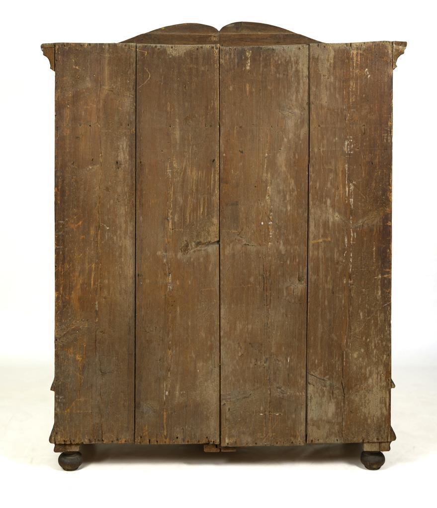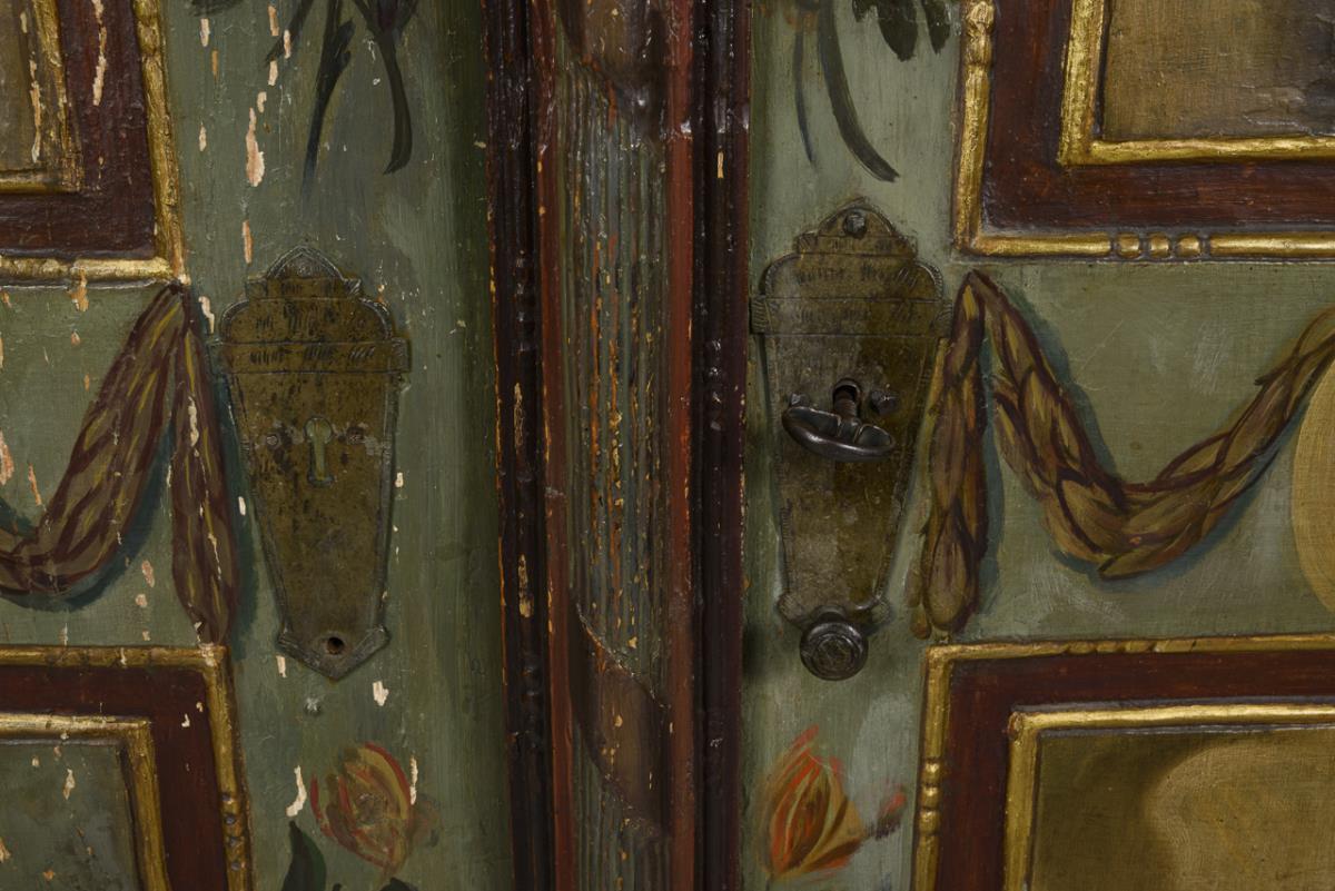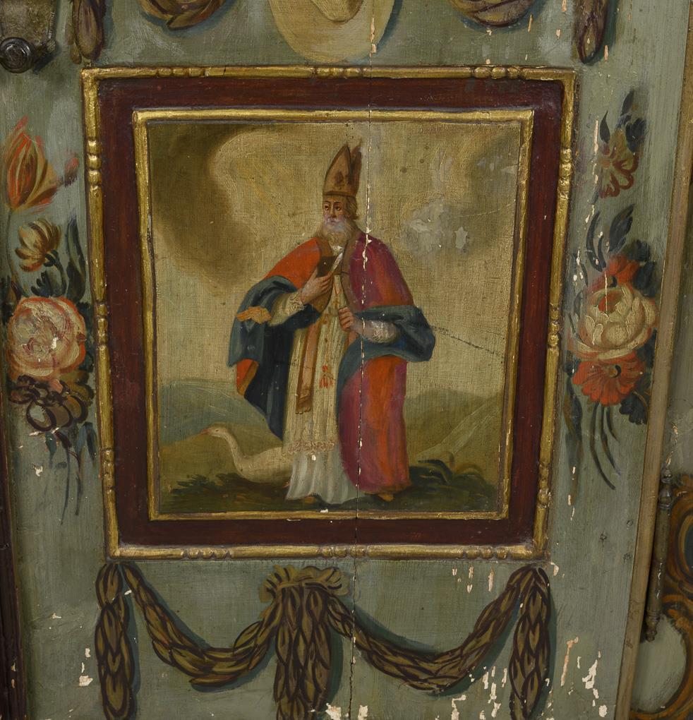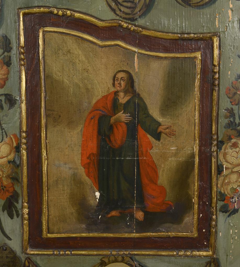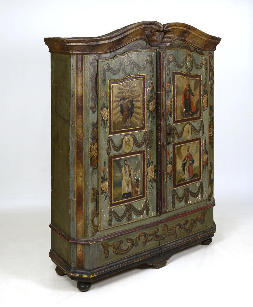 2-türiger Bauern-Dielenschrank mit geschweiftem Giebel in Brettbauweise, überwiegend blau gefasst, dekoriert mit kassettierten Feldern mit christlich ikonografischer Thematik: Marienbildnis (Mater Dolorosa - Schmerzensmutter), Bildnis eines Missionars in Afrika, Bildnis des Apostels Johannes mit rotem Mantel und Bildnis des Heiligen Martin mit Gans, umgeben von Girlanden und Blumen sowie 2 Medaillons mit Porträts; innen t-förmig geteilt und mit Kindertapete ausgekleidet, mehrere Einlegeböden, 3 Schübe in Kopfhöhe. Stärkere Alters-/Gebrauchsspuren, Bemalung teils gelöst und retuschiert.