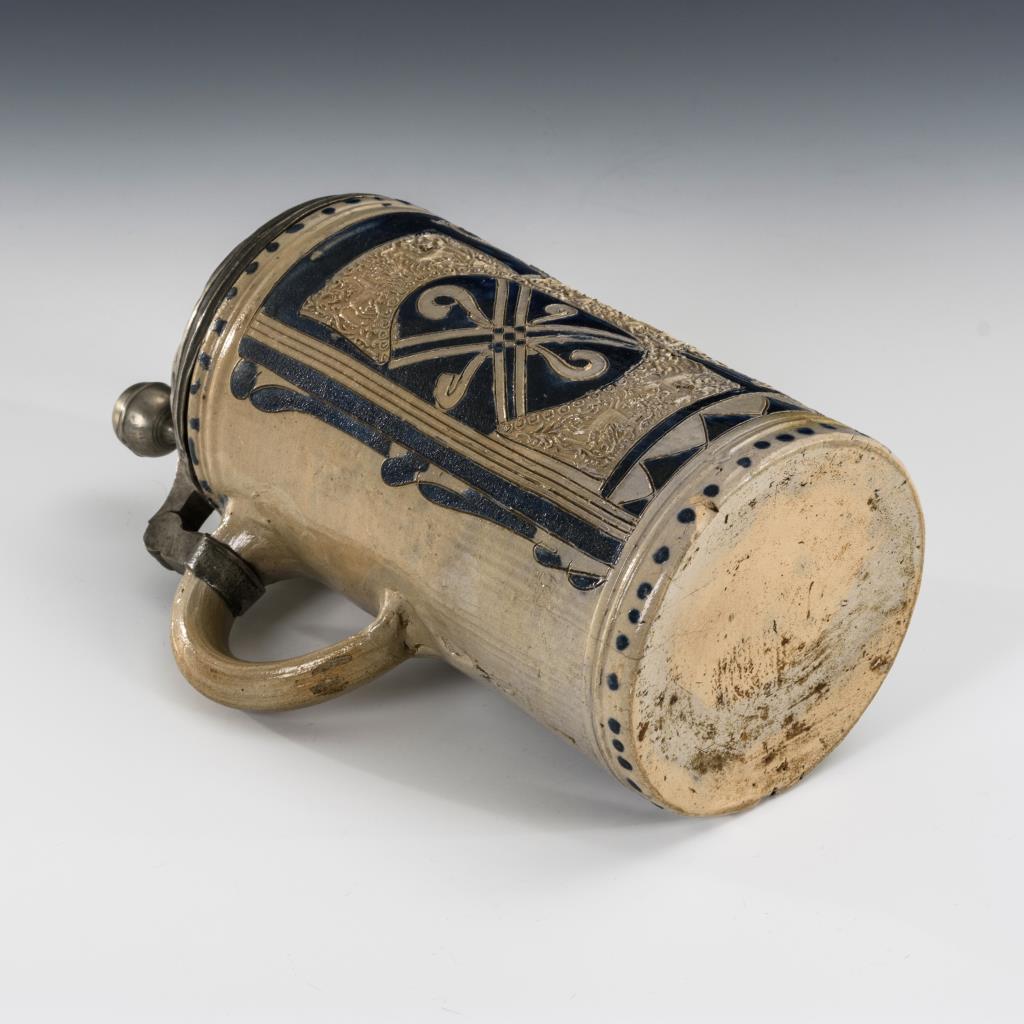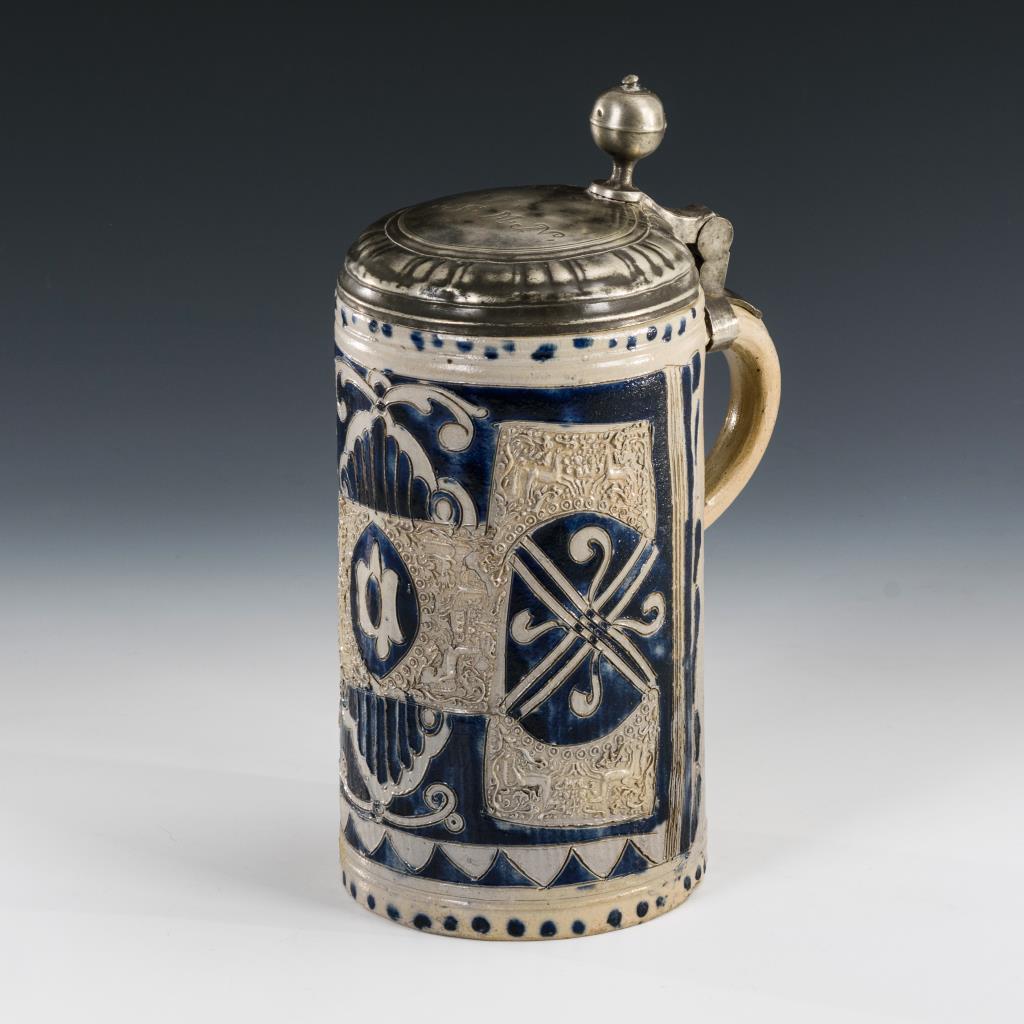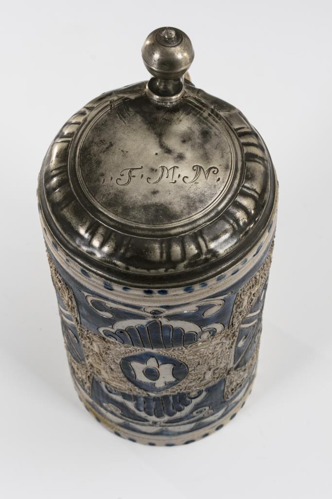 Zylinderkrug mit Tiermodeln und geritztem Floraldekor, Ohrenhenkel. Profilierter Zinndeckel mit Kugeldrücker, graviert "F.M.N.". Unsachgemäß reparierter Zinndeckel, leicht haarrissig.