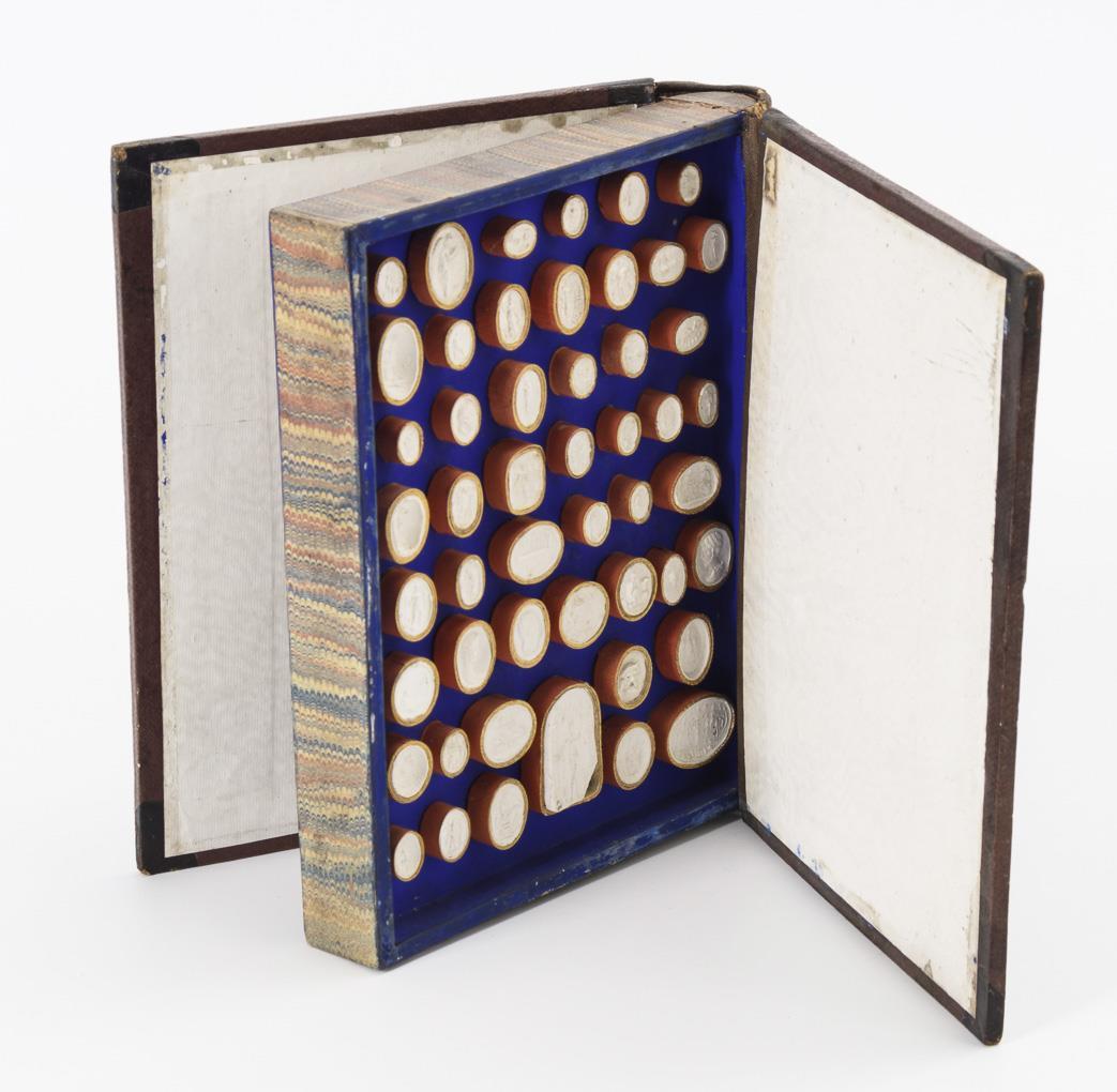 Ahorn gedrechselt und dunkel gebeizt, Leder und Karton, Perlstickerei bzw. Strohmarketerie bzw. Bein mit Türkis. H Fässer ca. 8 cm, Buch 16,5 x 13 cm.
