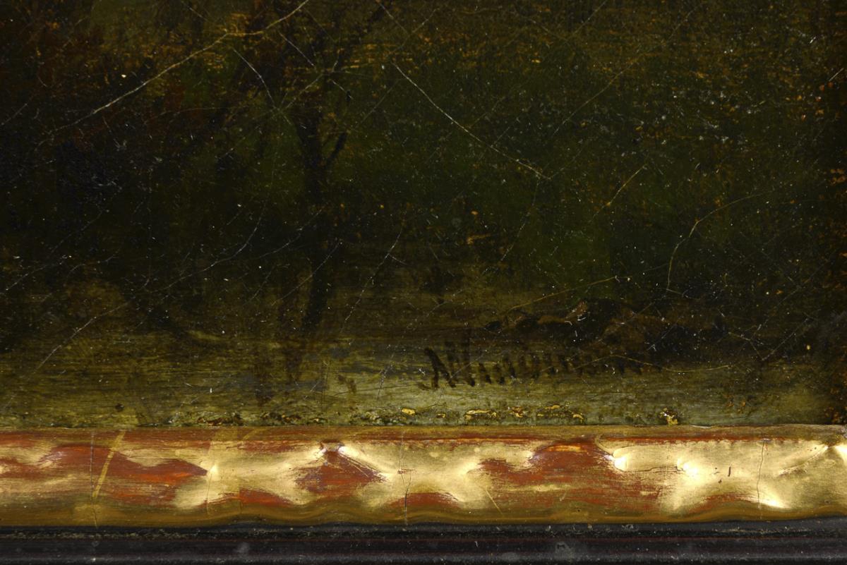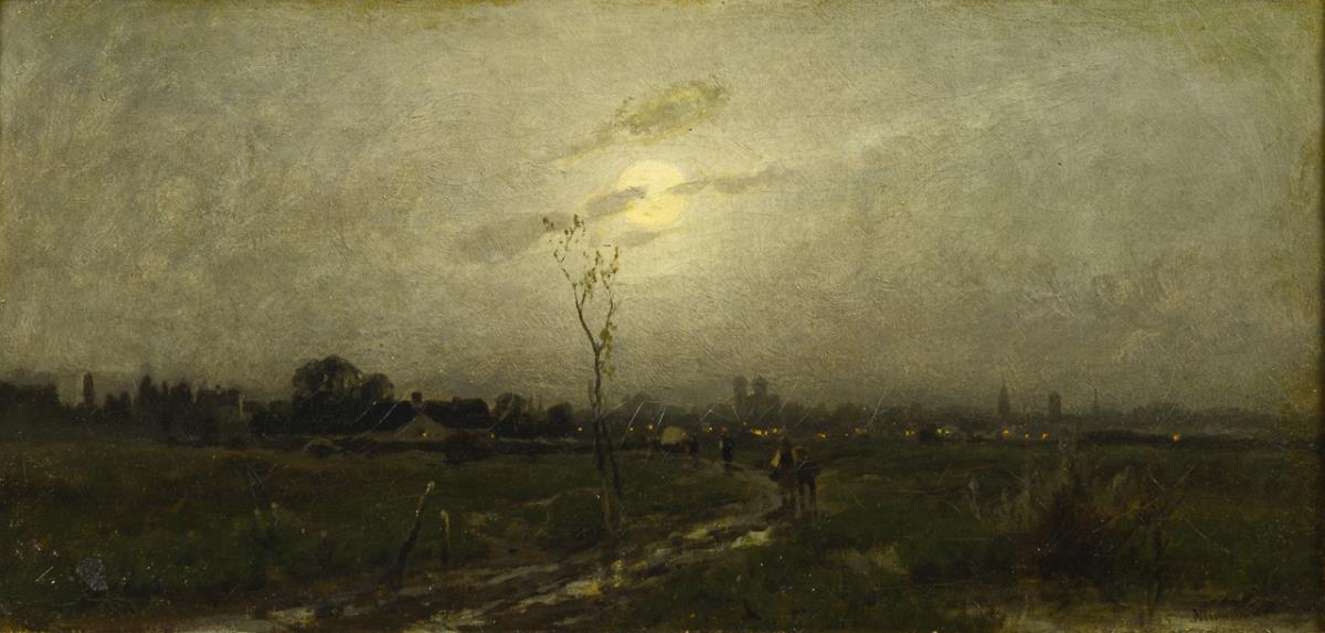 Staffagefiguren im Schein des Vollmondes nahe der Ortschaft und der Stadt München. Eine restaurierte Stelle mit Hinterklebung.