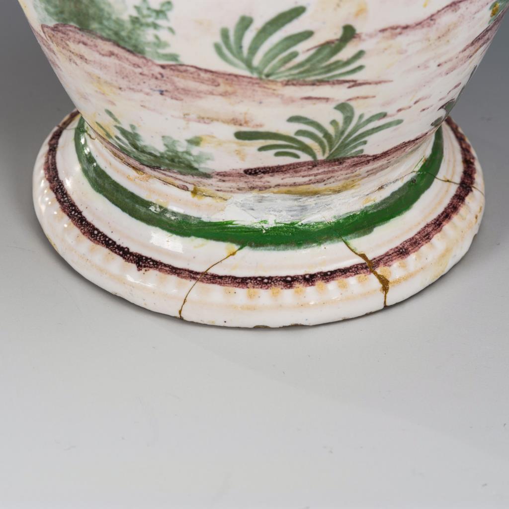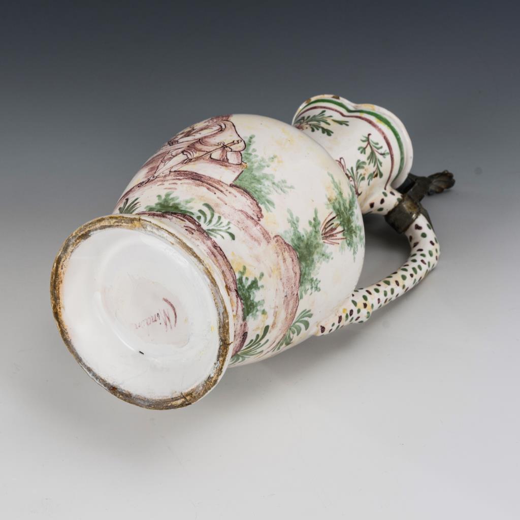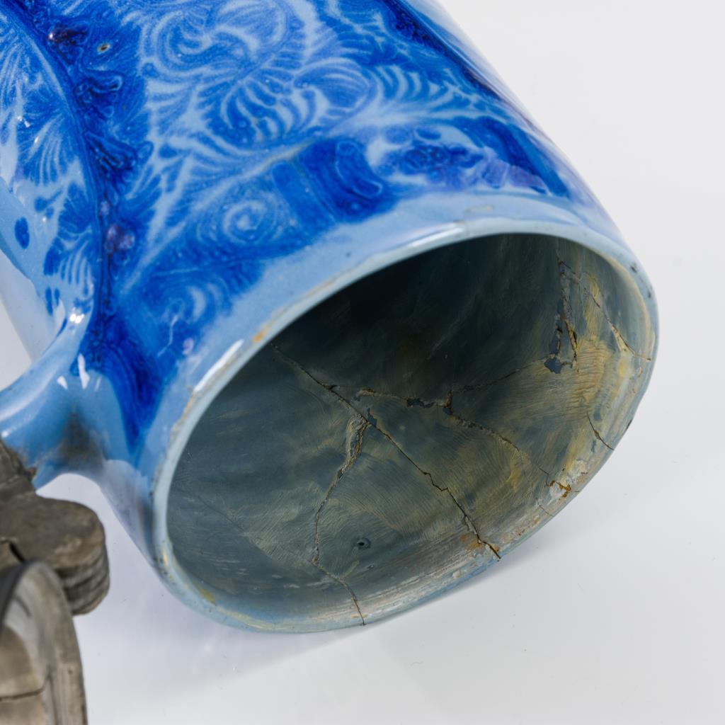 3 Walzenkrüge mit profilierten Zinndeckeln, 1 Enghalskrug, 1 Birnbauchkrug. Verschiedene Darstellungen mit Figuren, einem springenden Pferd und einer Stadtarchitektur. Jeweils mit Defekten und teils Restaurierungen.