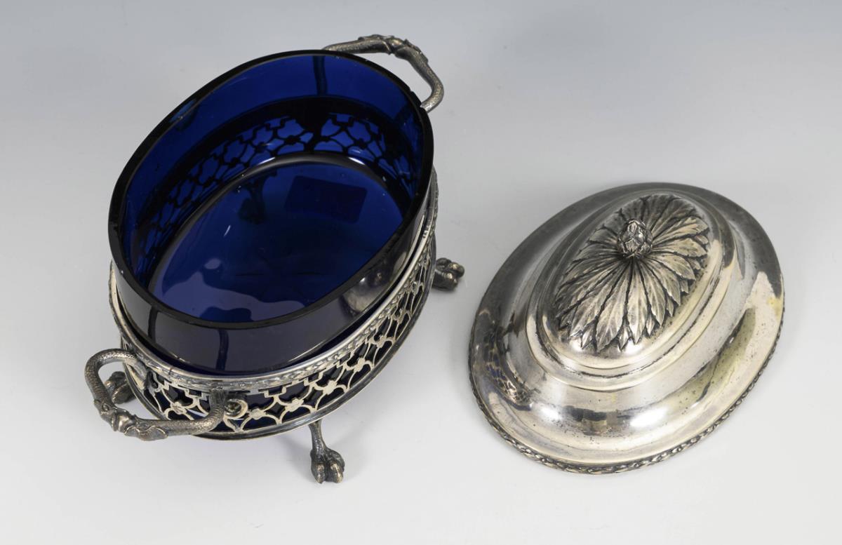Ovale Silberhalterung mit Schlangenhenkeln und Löwenfüßen, Deckel mit Blattrelief. Blauer Glaseinsatz wohl original. Glaseinsatz mit mehreren kleinen Chips, Knauf locker.