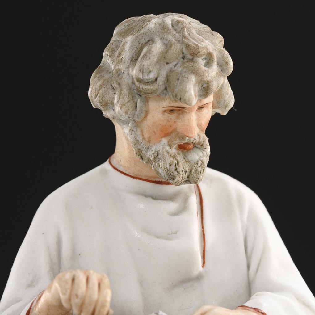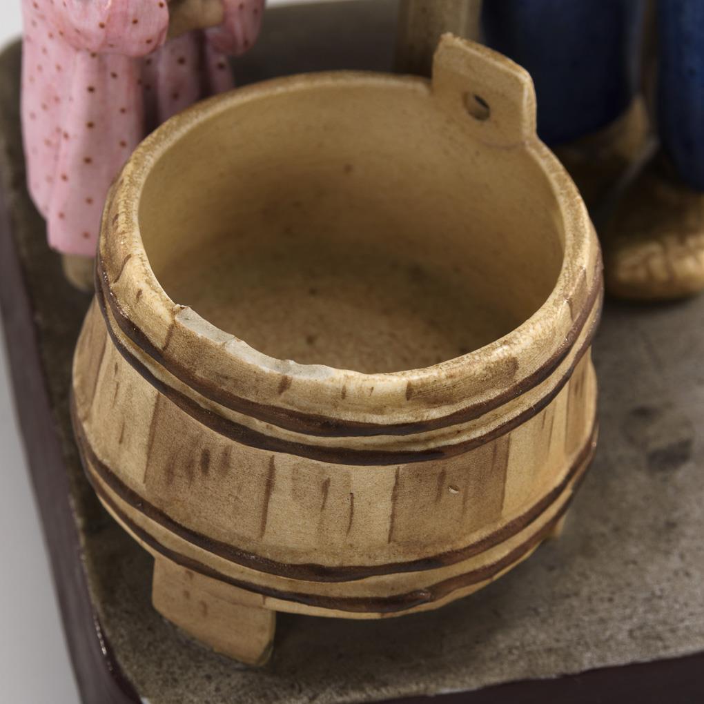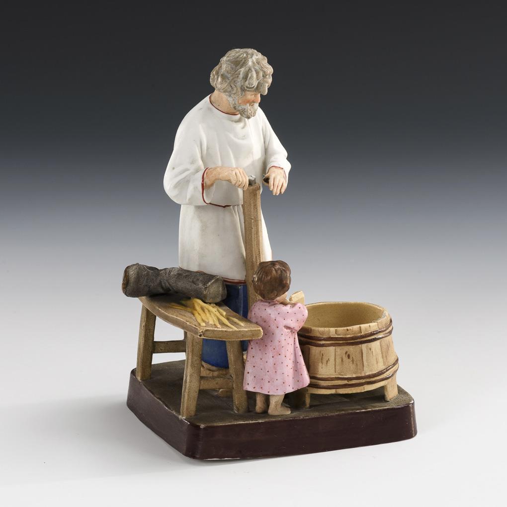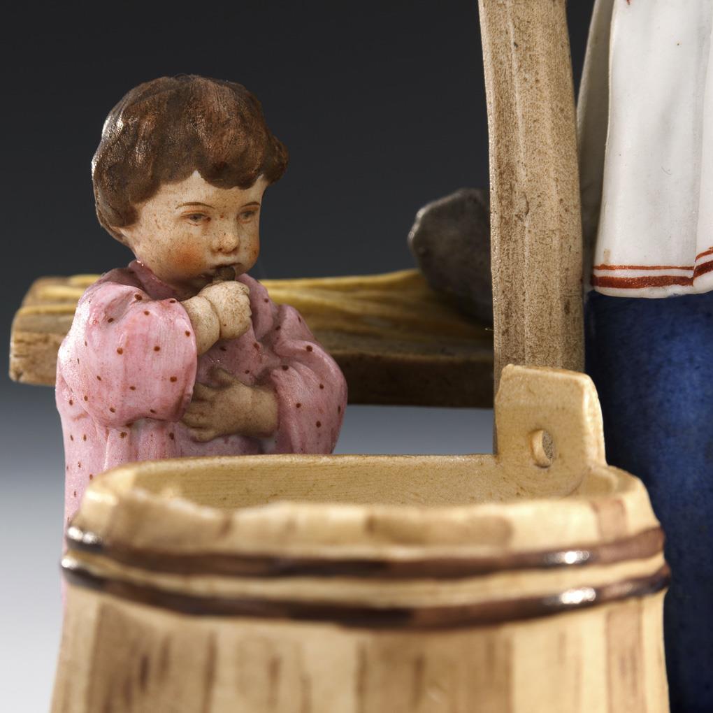 An einem Bottich stehender russischer Bauer mit kleinem Mädchen. Stockgriff fehlt, Bestoßung am Rand des Bottichs.
