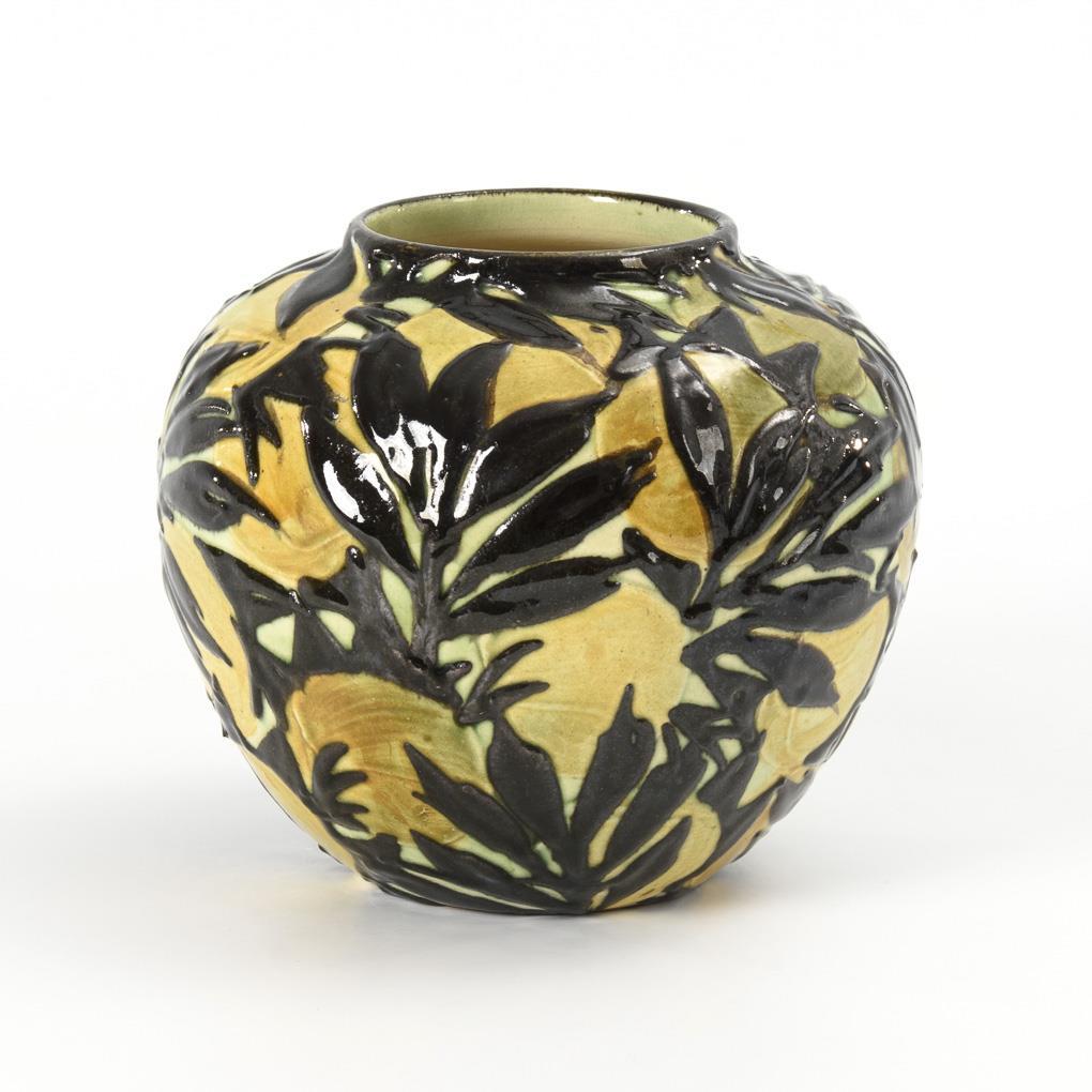 Roter Scherben, florale Schlickermalerei in Schwarz, Gelb und Grün. H 16 cm.