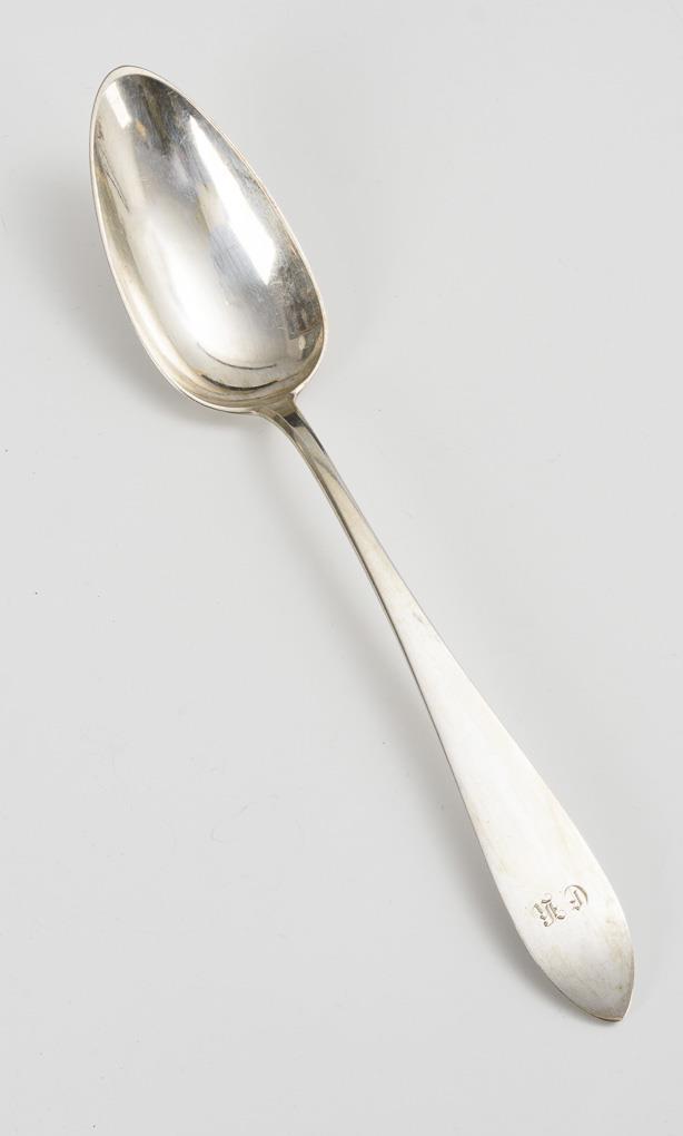 Umfangreiches Suppenbesteck: 18 große Löffel, 18 mittlere Löffel, 18 Kaffeelöffel, große Kelle, Saucenkelle, Vorlegelöffel und kleines Sieb. Monogramm "CK". In lederbezogenem Originalkasten mit 2 seitlichen Griffen (15 x 46,5 x 34,5 cm). Alters- und Gebrauchsspuren.