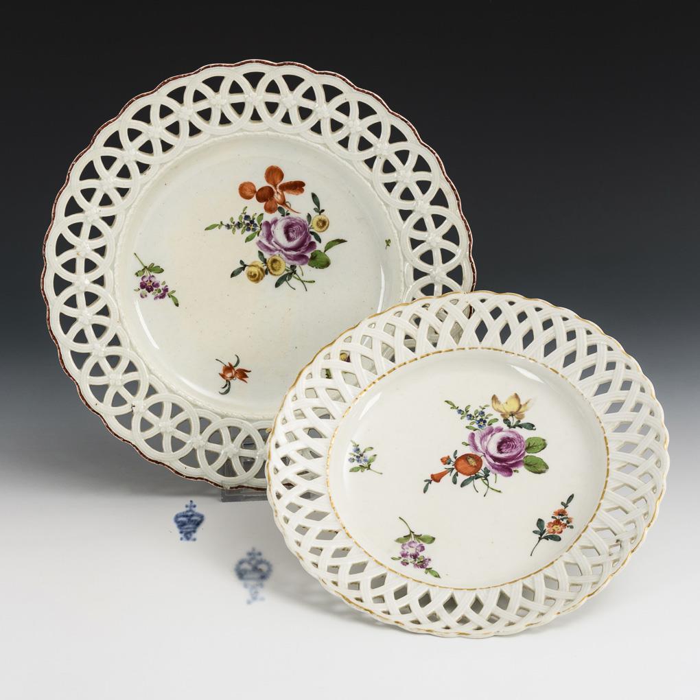 1x mit korbdurchbrochener Fahne (Ø 25 cm) und 1x mit ringdurchbrochener Fahne (Ø 28,5 cm). 1x mit kleiner Randrestaurierung, 1x mit kleiner Randbestoßung.