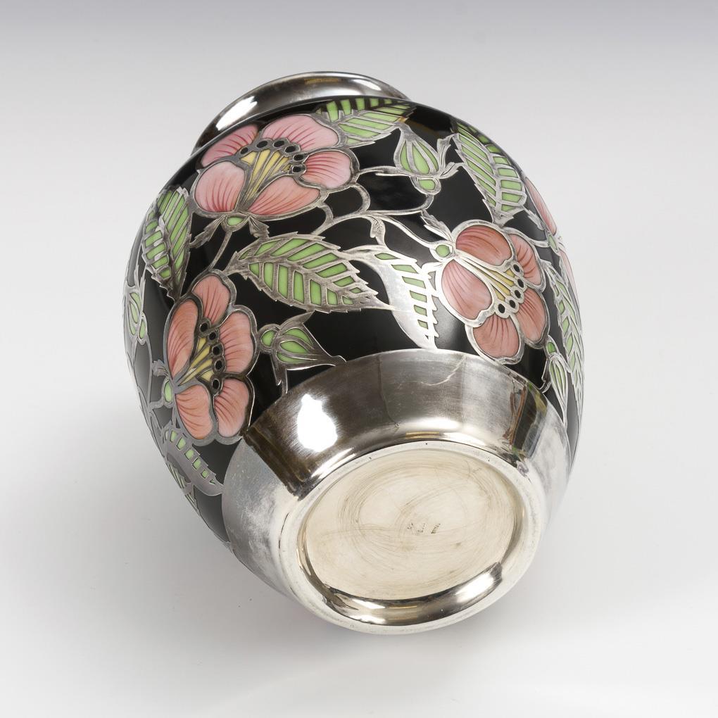 Balustervase mit Silberoverlay (1000 gepunzt) und farbigen, von Silber umrandeten Blumen auf schwarzem Fond.