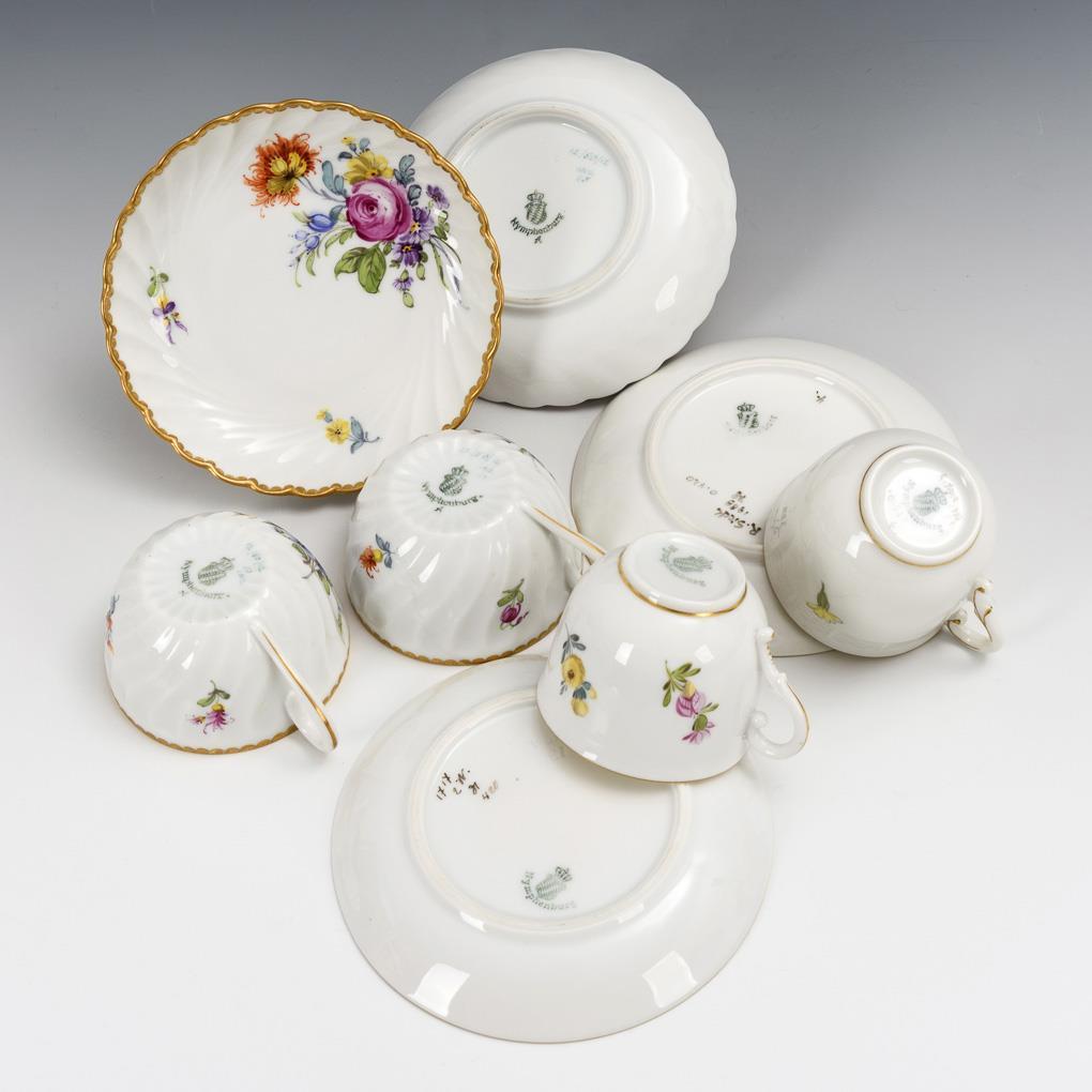Polychrom bemalt, goldstaffiert. H Tassen 3,5 und 5 cm, Ø Untertassen ca. 11,5 cm.