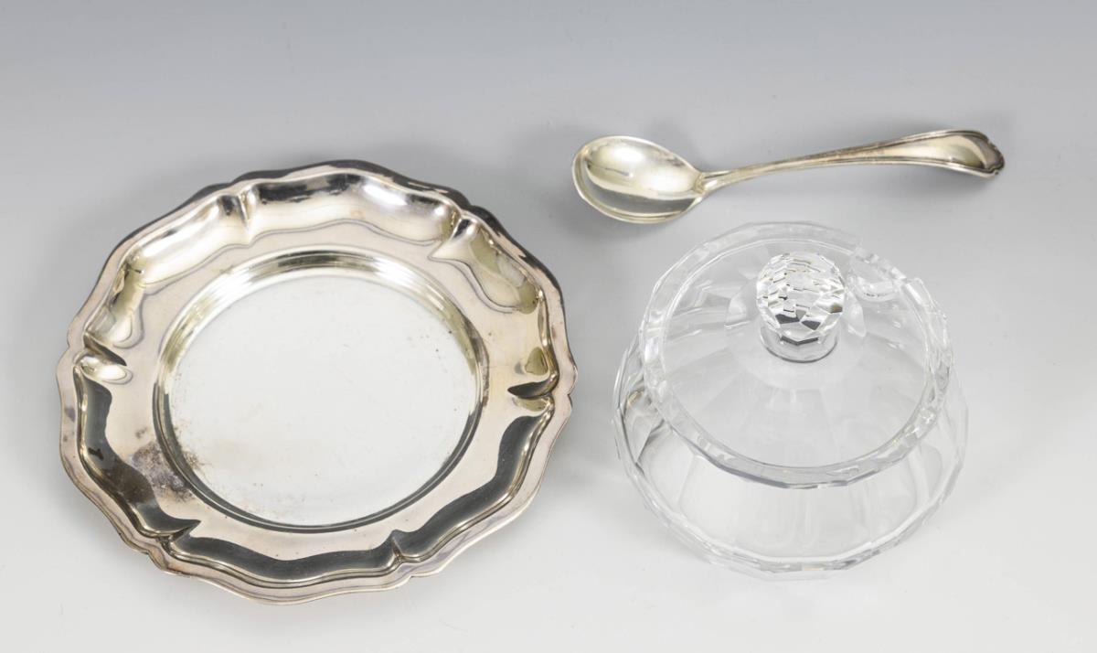 Runde Glasdose mit Facettenschliff. Dazu Löffel und passende Unterschale aus Silber. Glas mit kleinen Bestoßungen.
