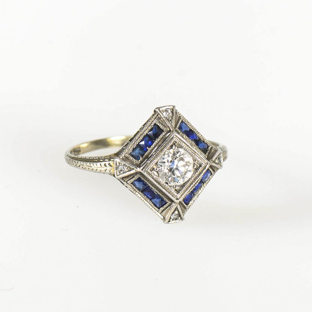 Art-déco-Ring mit Altschliff-Brillant, Saphiren und Diamantrosen.