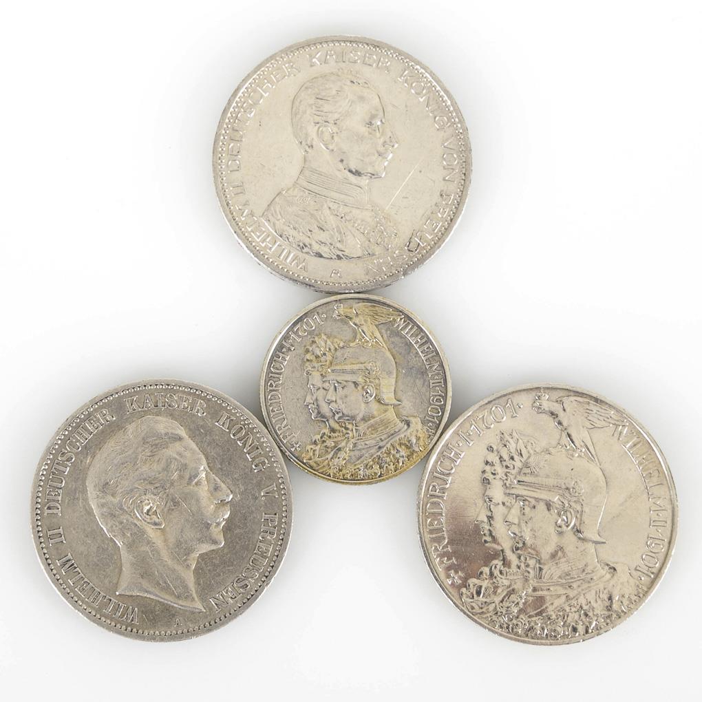 5 Mark, 1901, "Friedrich I., 1701, Wilhelm II. , 1901", Doppelporträt. Zustand: vorzüglich - Stempelglanz. / 5 Mark, 1914, "Wilhelm II. Deutscher Kaiser König von Preussen", in Uniform. / 5 Mark, 1898, "Wilhelm II. Deutscher Kaiser König v. Preussen". / 2 Mark, 1901, "Friedrich I., 1701, Wilhelm II. , 1901", Doppelporträt. 3x Zustand: sehr schön.