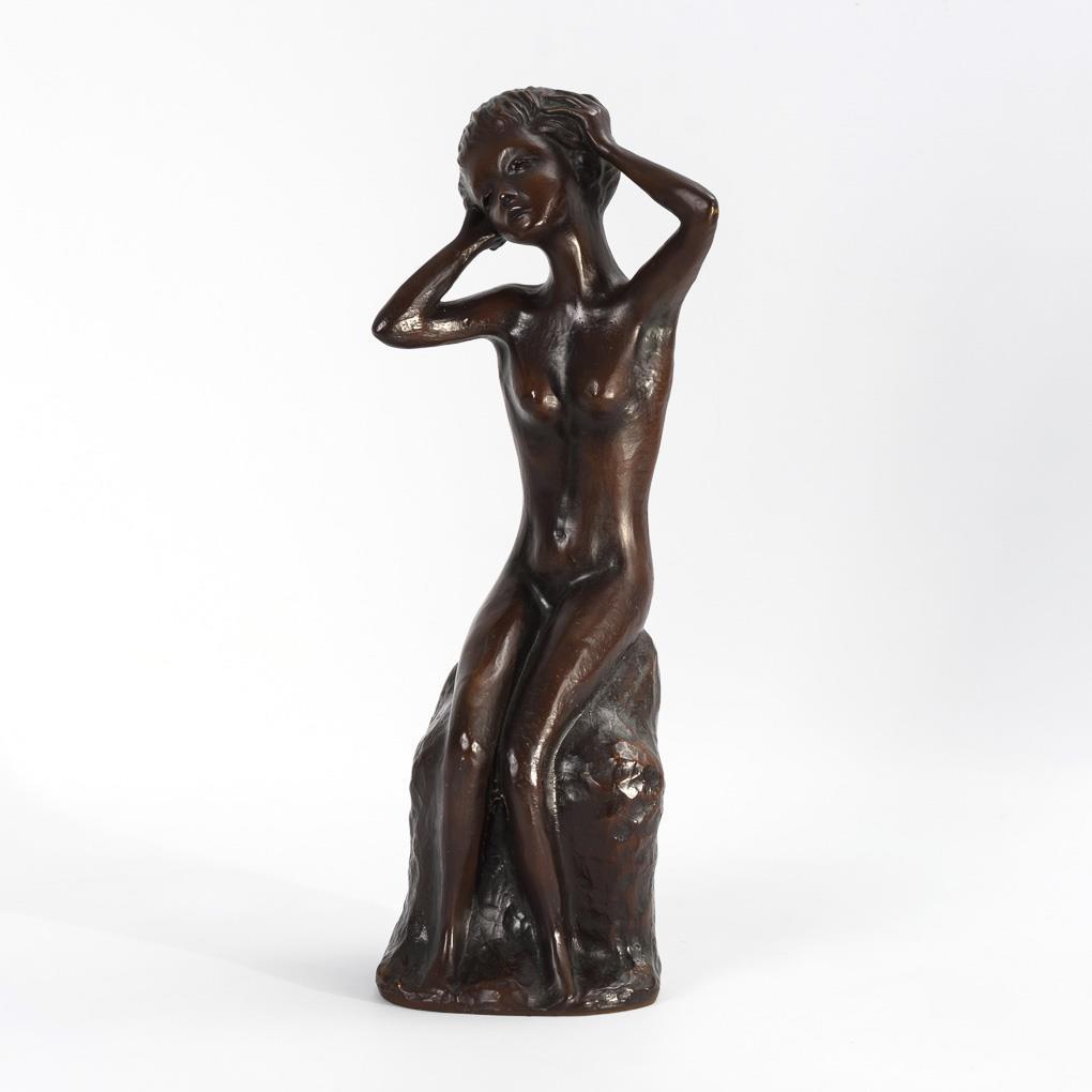 Sitzender Frauenakt in ausdrucksstarker Geste. Dazu vom Künstler unterschriebenes Zertifikat zur Skulptur mit Titel und Zählung 4/6. Einige kleinere Patinaschäden.