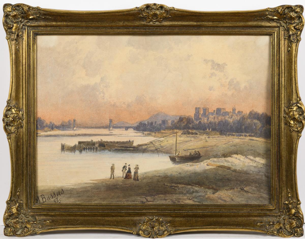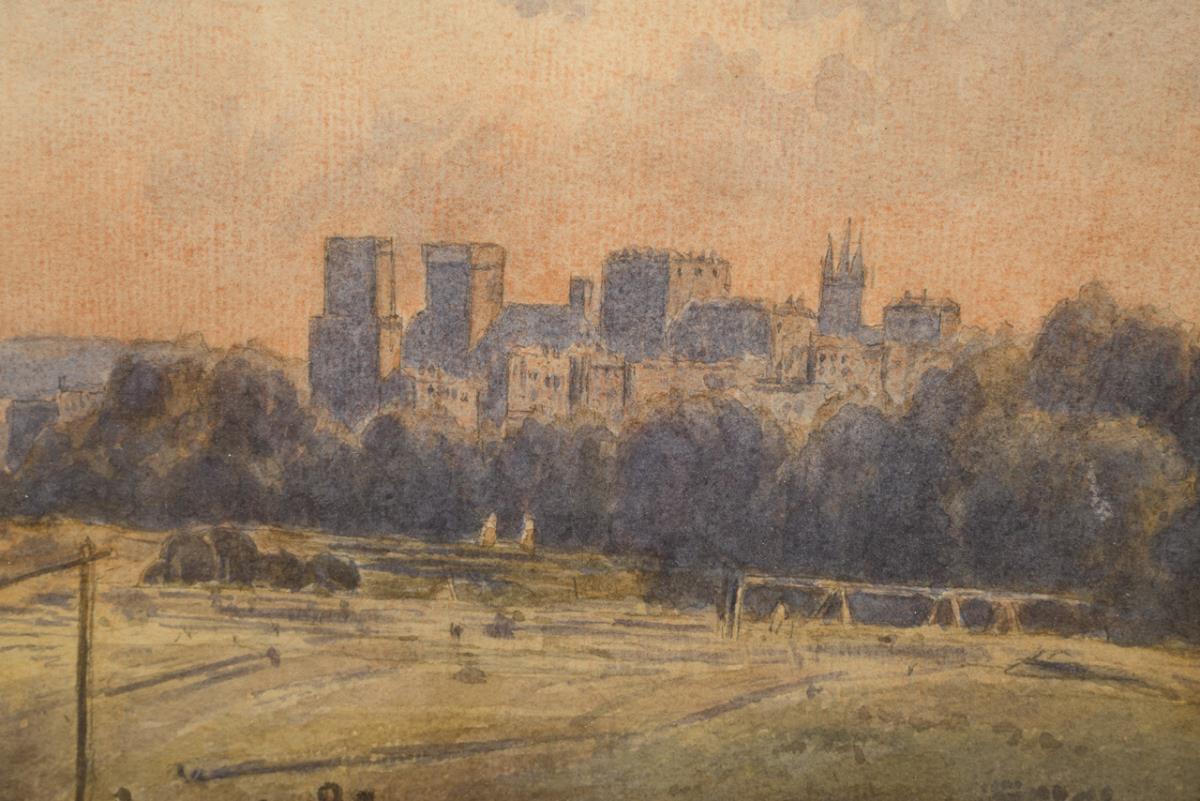 Wohl englische Landschaft mit breitem Fluss und einer großen Burganlage unter leicht wolkigem Himmel.