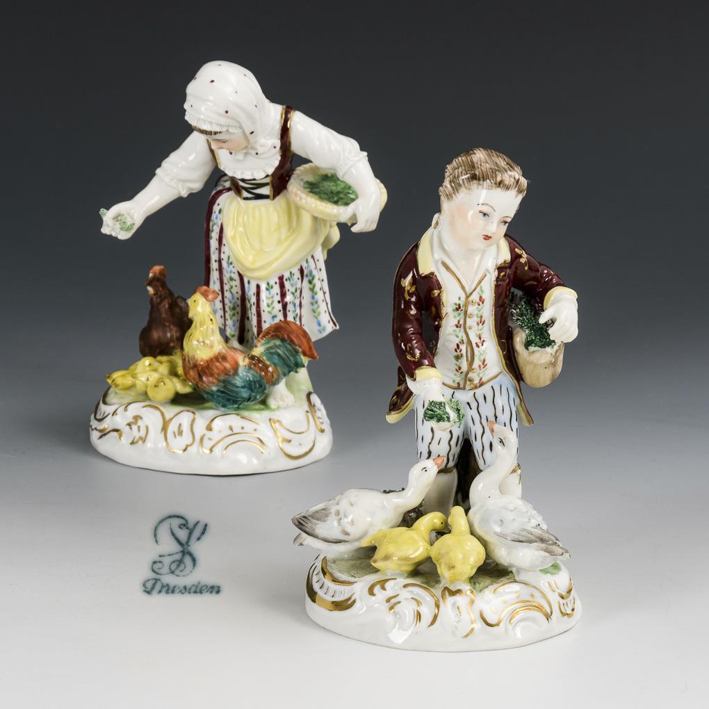 Hühnerfütterndes Mädchen und entenfütternder Knabe. Potschappel.