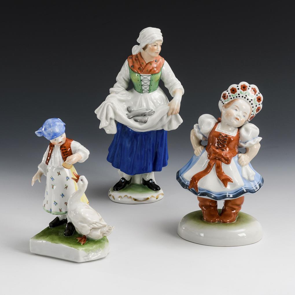 1x Fischverkäuferin, Modell-Nr. 5703 (H 24,5 cm). / 1x tanzendes Mädchen, Modell-Nr. 5423 (H 20 cm). / 1x Bauernmädchen mit Gans, Modell-Nr. 5545 (H 17 cm). 1 Finger des Gänsemädchens bestoßen.