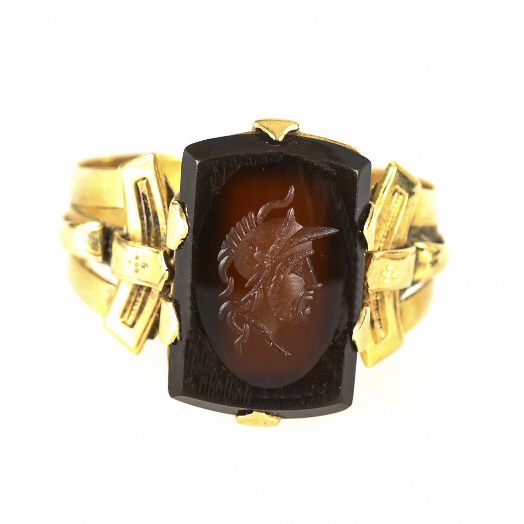 Krappengefasste Karneoltafel mit antikisierend geschnittenem Kriegerprofilkopf, zwischen breiter Schiene.