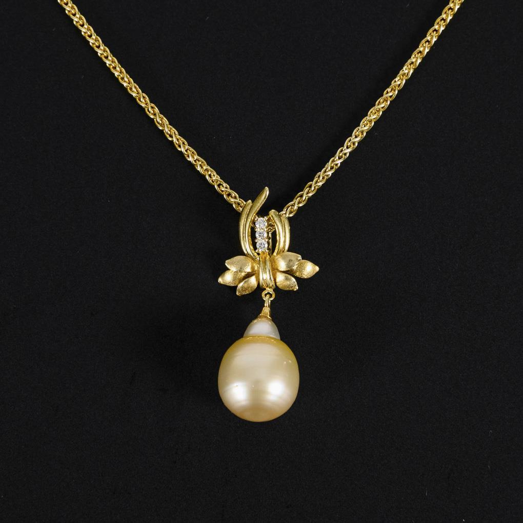 Gelbgold 18 k gestempelt, Kette Gelbgold 585 gestempelt. Anhänger 3 x 1,5 cm. Perle 1,5 x 1 cm. Kette L 42 cm. 8,3 g.