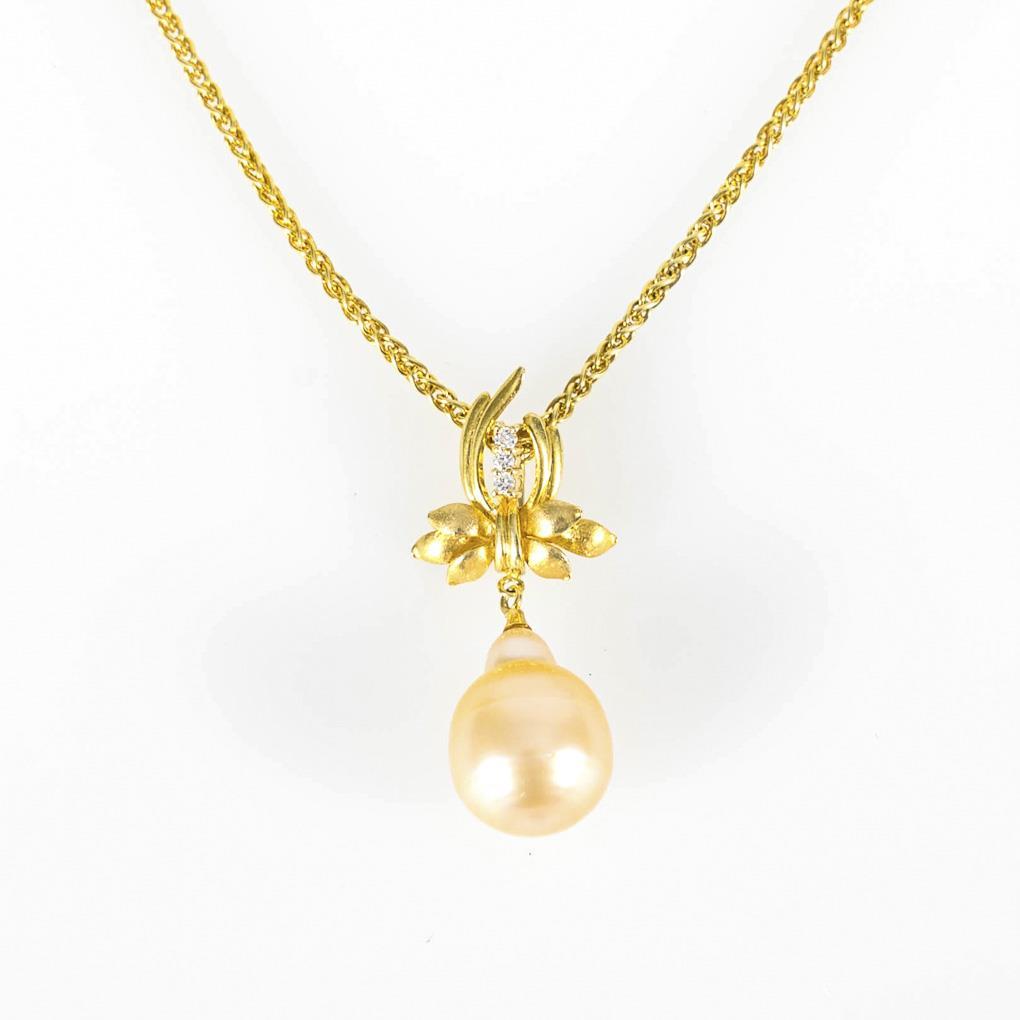 Floraler Anhänger mit 3 kleinen Brillanten und abgehängter Barockperle. Ziergliederkette mit Karabinerschließe.