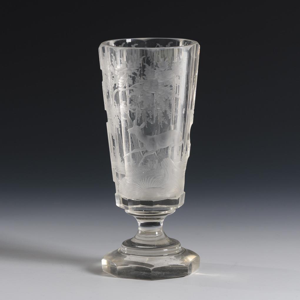 Konische, achtfach facettierte Kuppa, kurzer Schaft, polygonaler Fuß. Umlaufend eine gravierte Waldlandschaft mit Hirsch und Hirschkuh.