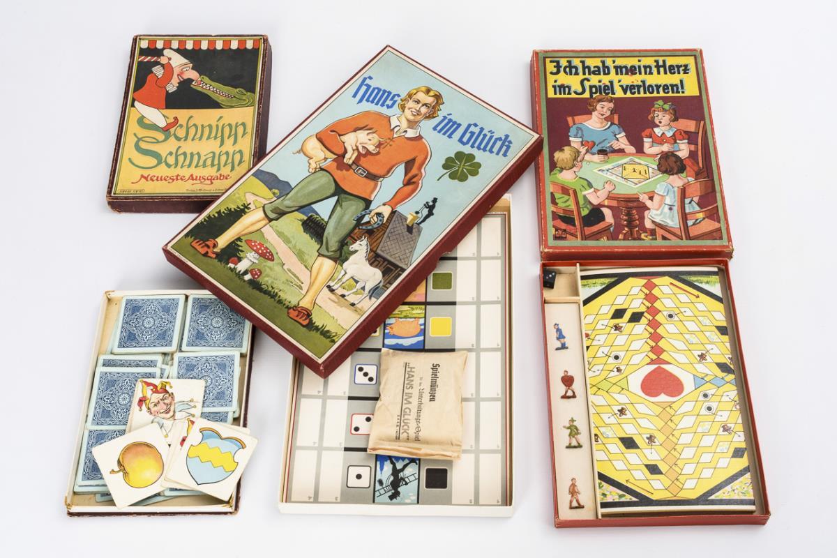 "Schnipp Schnapp. Neueste Ausgabe". Verlag J.W. Spear & Söhne, Nürnberg. / "Ich hab mein Herz im Spiel verloren!" Klee-Spiele, Fürth. / "Hans im Glück". Verlag unbekannt. Gut erhalten, wohl vollständig. Kartons mit kleinen Defekten.