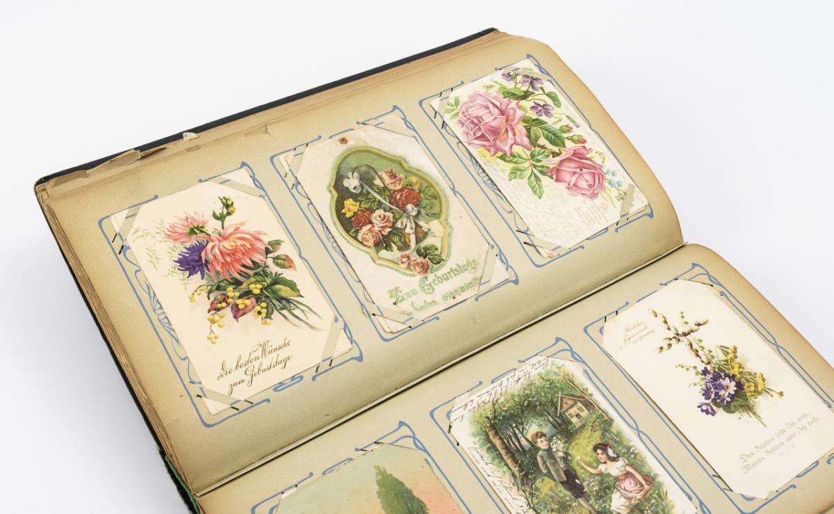 Kitsch- und Glückwunschkarten, teils geprägt, um 1920, im blauen "Postkarten Album" mit Blüten.