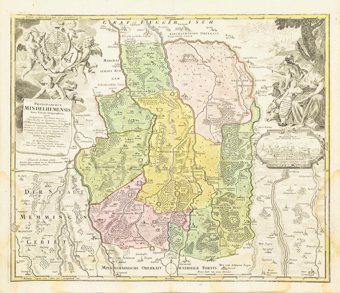 Dekorative historische Karte der Region um Mindelheim und anliegender Forstbezirke, mit figürlicher Titelkartusche "Protoparchiae Mindelhemensis [...]" und großer allegorischer Kartusche mit kleiner Ansicht der Stadt Mindelheim und Legende, Meilenzeiger. Bugfalte, Wasserflecken.